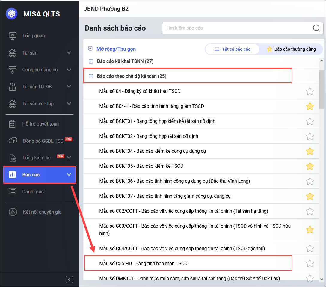 Bước 1: Vào menu *Báo cáo\Báo cáo theo chế độ kế toán* chọn C55-HD: Bảng tính hao mòn TSCĐ.