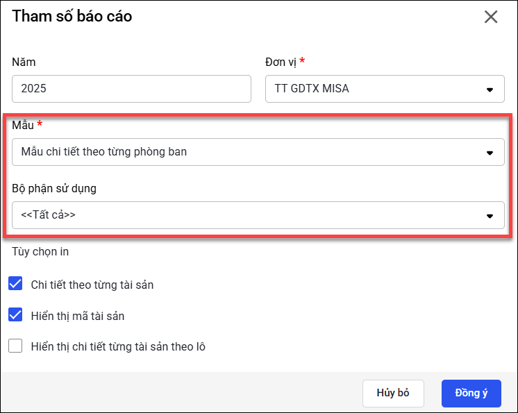 • Chọn Mẫu chi tiết theo từng phòng ban nếu muốn in số liệu hao mòn theo từng phòng ban. Mẫu này sẽ kèm theo tham số Bộ phận sử dụng.