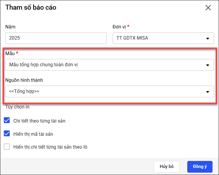 • Chọn “Tổng hợp” để hiển thị toàn bộ tài sản, không phân biệt theo nguồn hình thành (thường chọn tham số này).