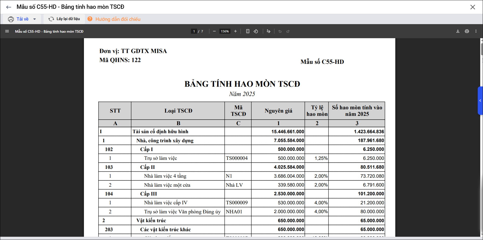 Bài viết này giúp Anh/chị in được C55-HD (C55a-HD): Bảng tính hao mòn TSCĐ, mẫu này giúp theo dõi và tính toán hao mòn tài sản cố định trong kỳ báo cáo.