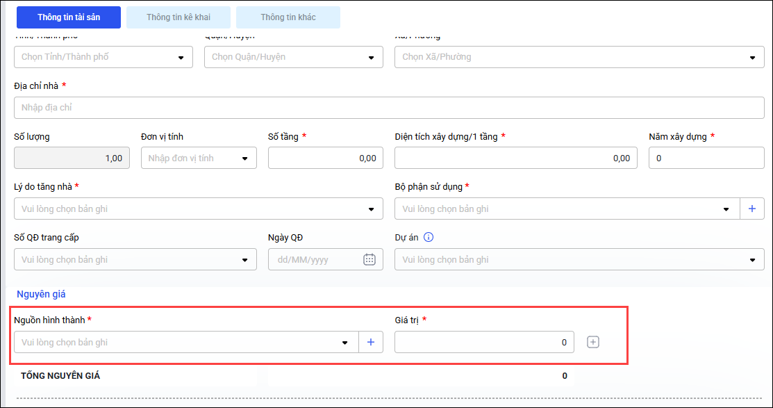 Giải pháp: Anh/chị thoát giao diện đang khai báo TSCĐ bằng cách bấm Hủy (góc trên bên phải) hoặc bấm phím F5 trên bàn phím máy tính, sau đó khai báo lại TSCĐ là Nhà theo hướng dẫn tại đây và tích chọn Có quản lý đất.