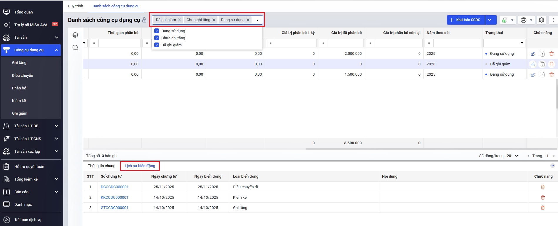 Đồng thời Anh/chị có thể xem các chứng từ phát sinh của mã CCDC đang chọn ở mục Lịch sử biến động bên dưới.