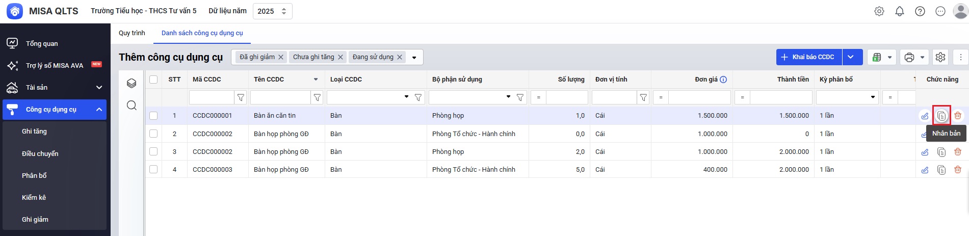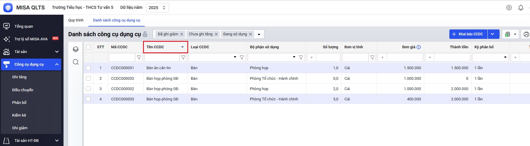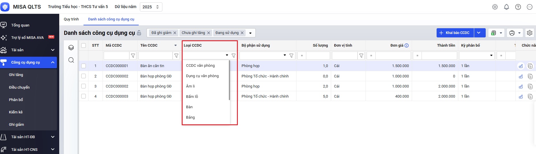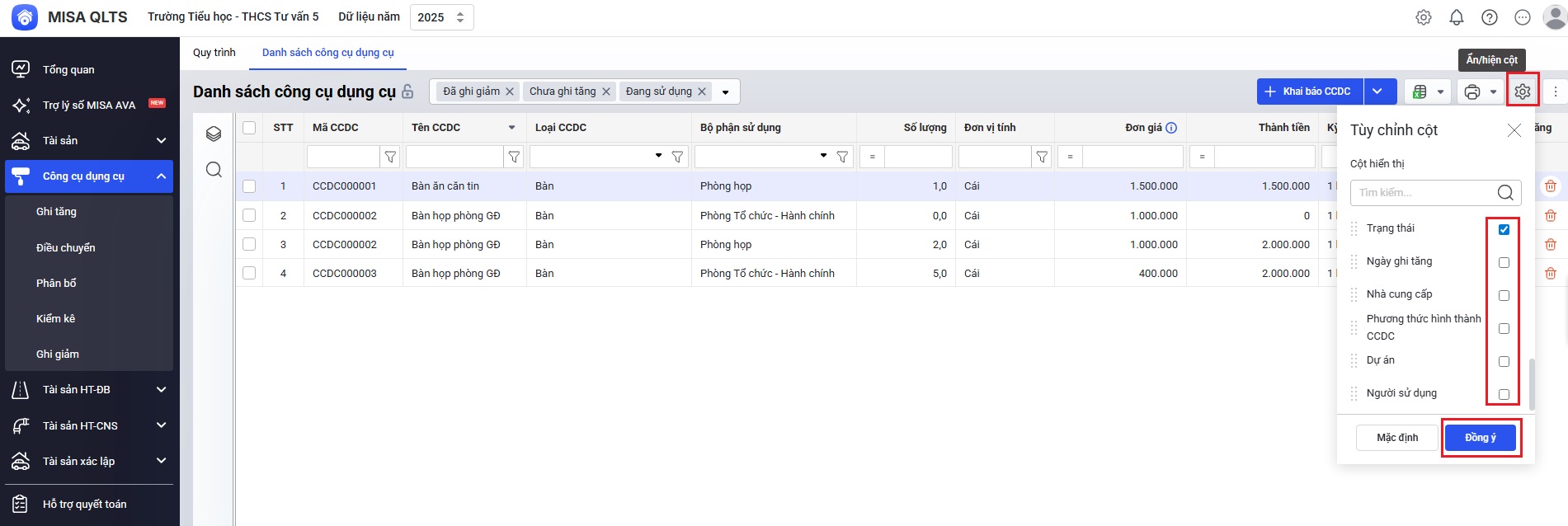 Vào menu Công cụ dụng cụ, trên màn hình Danh sách công cụ dụng cụ, Anh/chị có thể lọc nhanh trạng thái của CCDC bằng cách lựa chọn trạng thái muốn hiển thị trên danh sách: Đang sử dụng, Chưa ghi tăng, Đã ghi giảm.