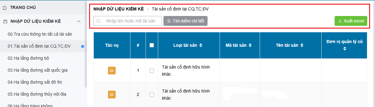 - Vào Tổng kiểm kê/Kết cấu hạ tầng