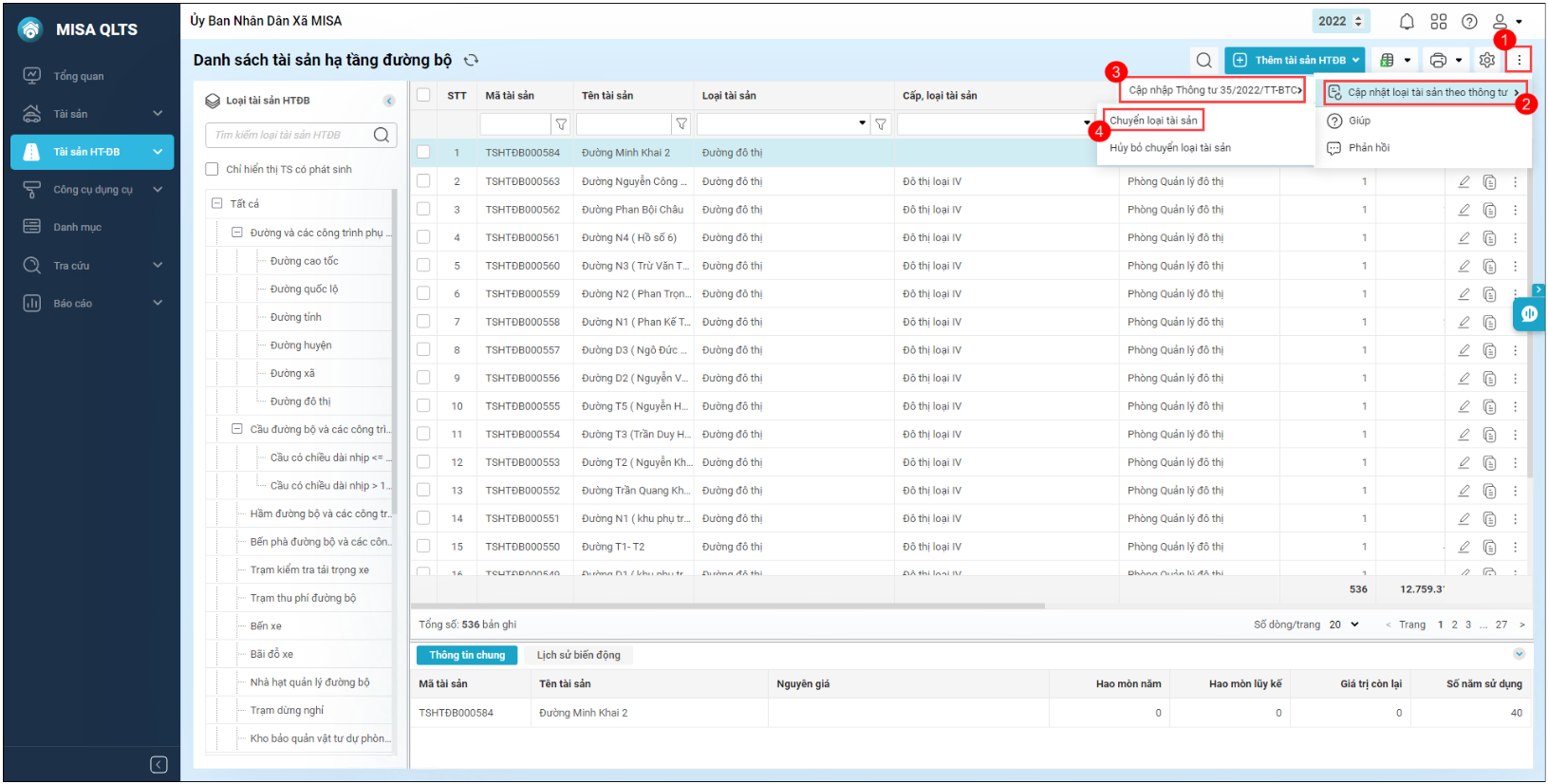 1. Tại giao diện Danh sách tài sản hạ tầng đường bộ, nhấn vào biểu tượng Tùy chọn, chọn Cập nhật loại tài sản theo thông tư, chọn Cập nhật TT 35/2022/TT-BTC, chọn Chuyển loại tài sản.