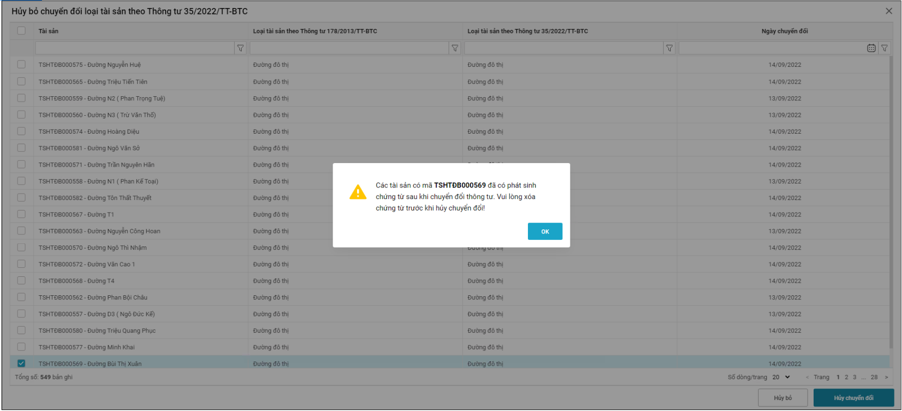 4. Trường hợp tài sản đã có phát sinh chứng từ, phần mềm sẽ hiển thị cảnh báo không thể chuyển đổi được. Anh/chị cần xóa chứng từ để có thể thực hiện chuyển đổi.