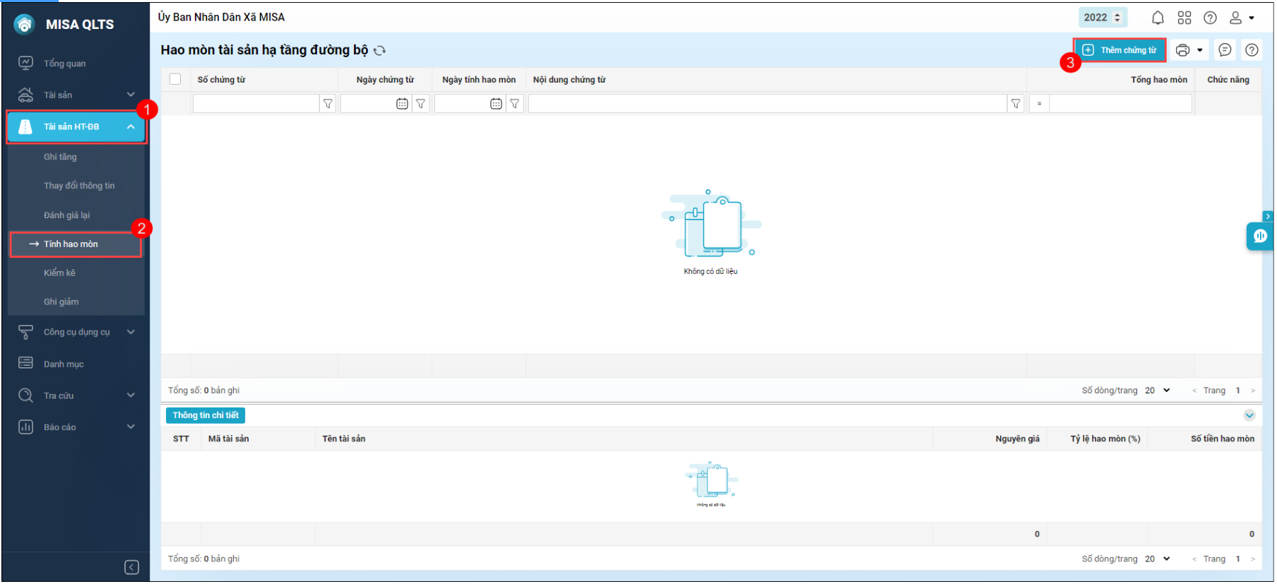 1.Tại menu Tài sản HTĐB/Tính hao mòn. Nhấn Thêm chứng từ.
