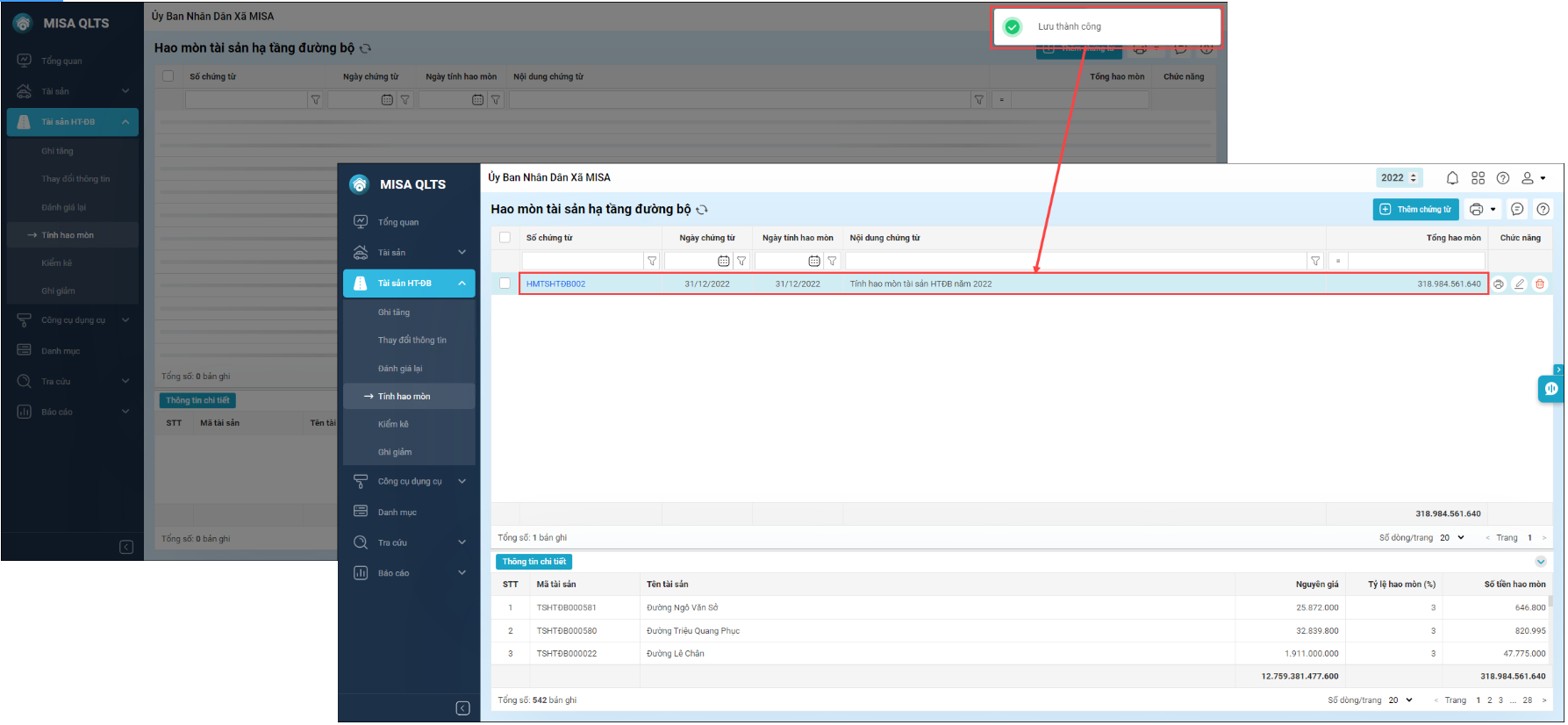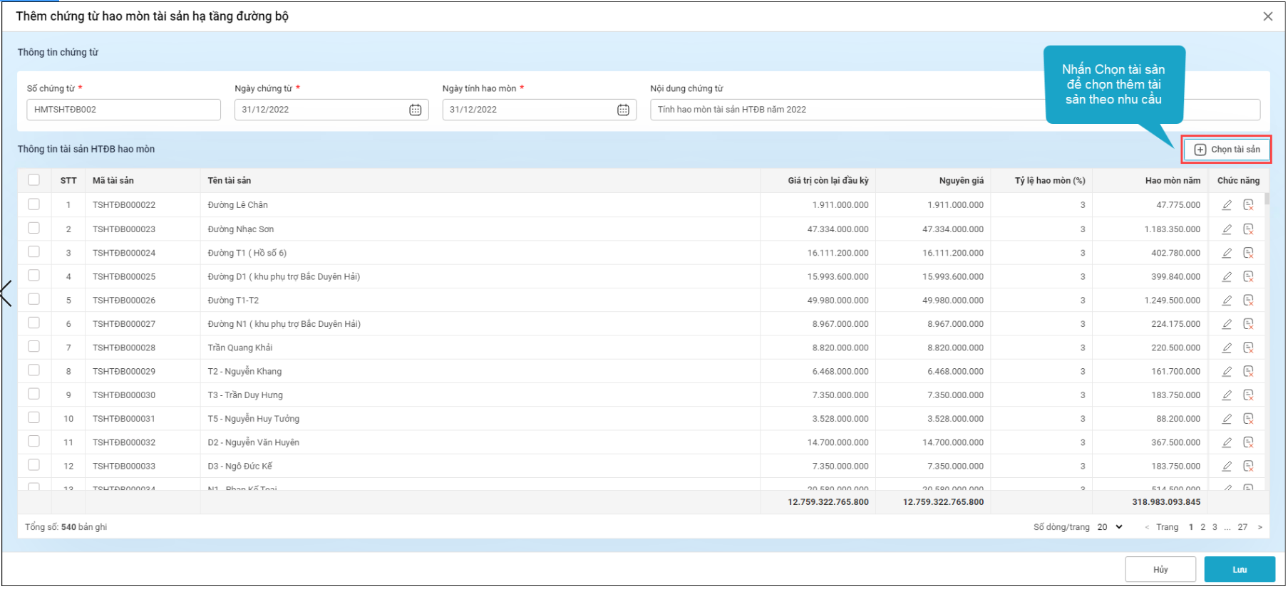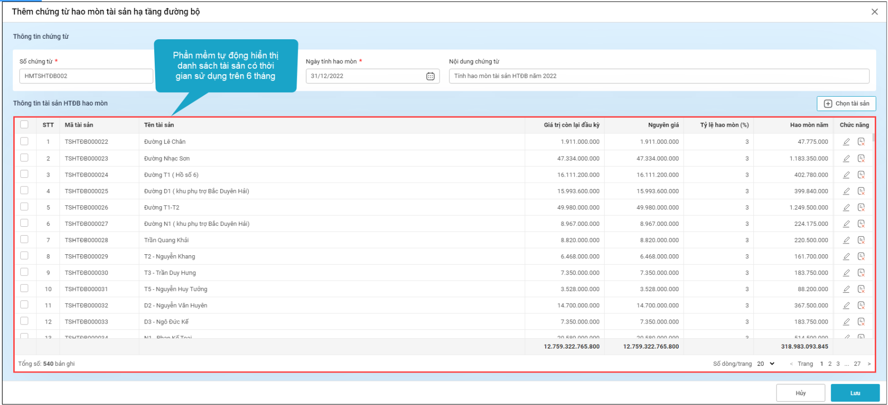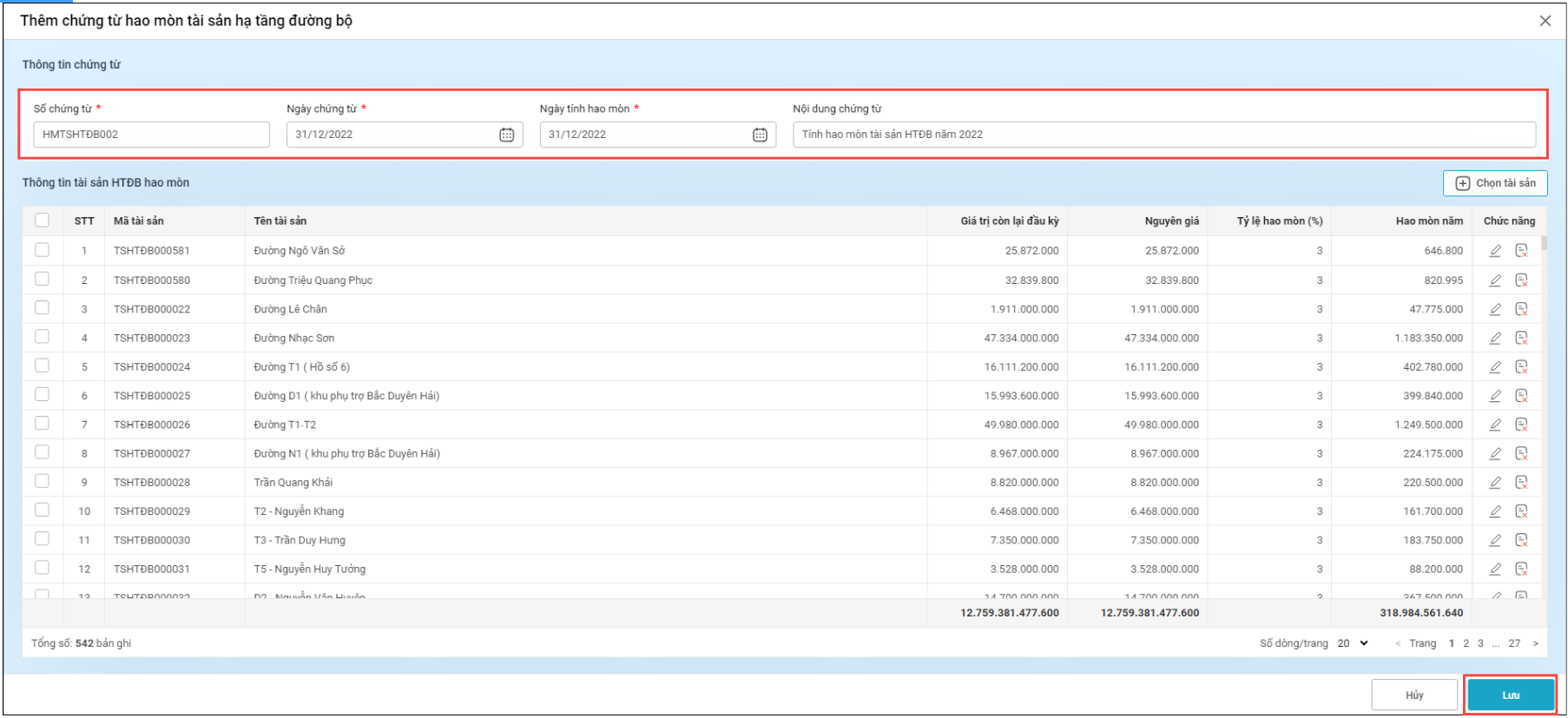 3. Nhập Số chứng từ, Ngày chứng từ, Ngày tính hao mòn, Nội dung chứng từ. Nhấn Lưu để thực hiện tính hao mòn.