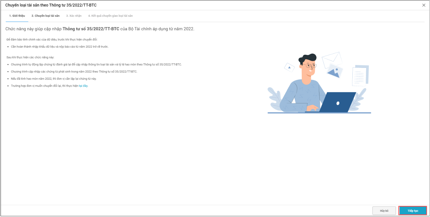 Bước Giới thiệu giúp anh/chị hiểu thêm về chức năng Cập nhật thông tin tài sản theo Thông tư 35/2022/TT-BTC và các lưu ý có liên quan. Nhấn Tiếp tục để chuyển sang bước tiếp theo.