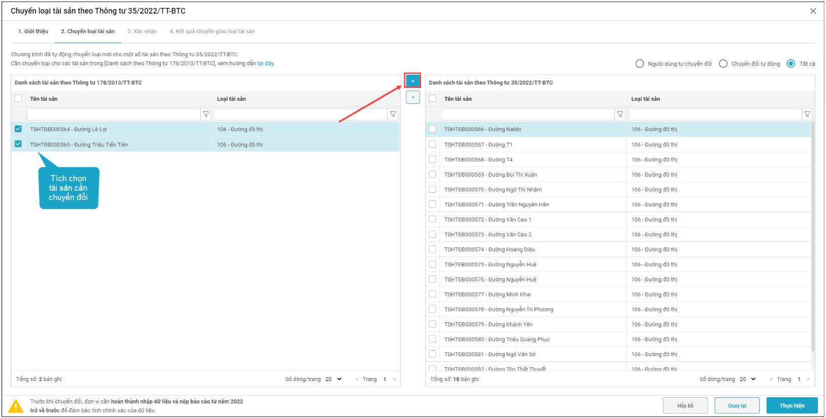 – Để thực hiện chuyển đổi sang loại tài sản theo thông tư mới anh/chị tích chọn 1 hoặc nhiều tài sản, sau đó nhấn biểu tượng mũi tên >