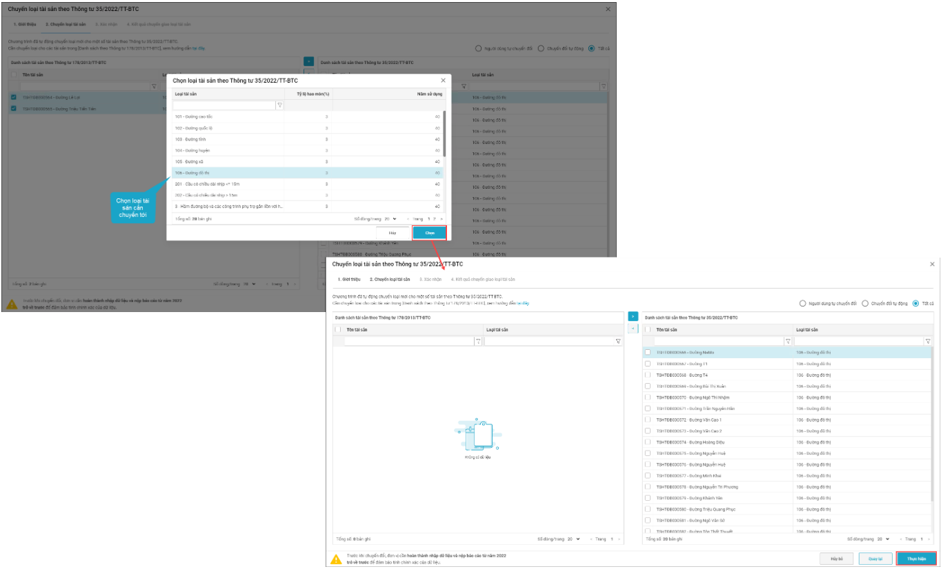 – Tại giao diện Chọn loại tài sản theo Thông tư 35/2022/TT-BTC, anh/chị chọn loại tài sản muốn chuyển tới bằng cách kích chuột vào loại tài sản cần chọn, nhấn Chọn, sau đó nhấn Thực hiện.