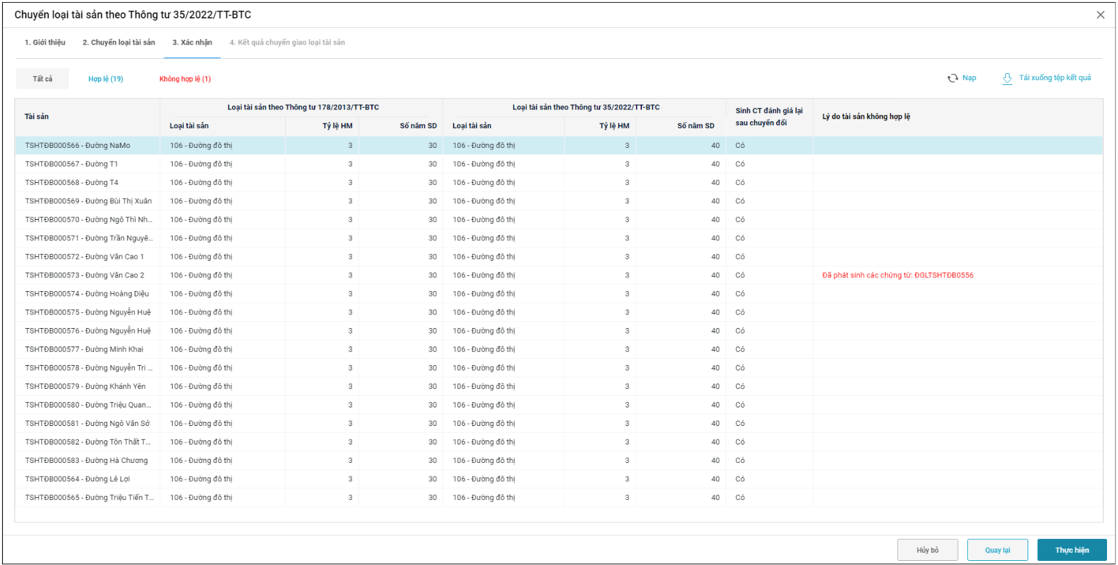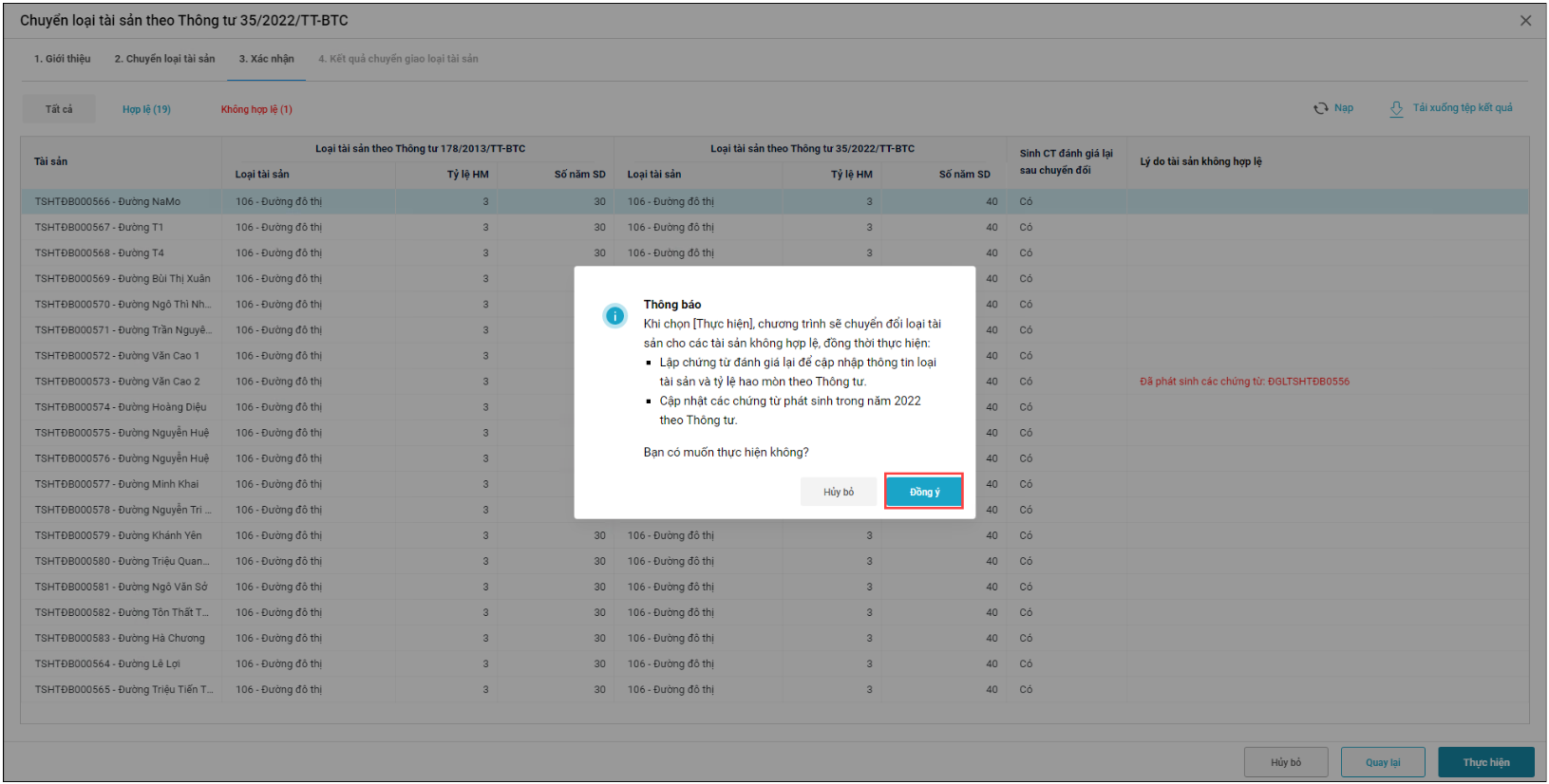 3. Tại bước Xác nhận, phần mềm hiển thị tổng số bản ghi được chọn để chuyển đổi, đồng thời hiển thị số tài sản hợp lệ, số tài sản không hợp lệ. Anh/chị nhấn Thực hiện, chọn Đồng ý để xác nhận chuyển đổi.