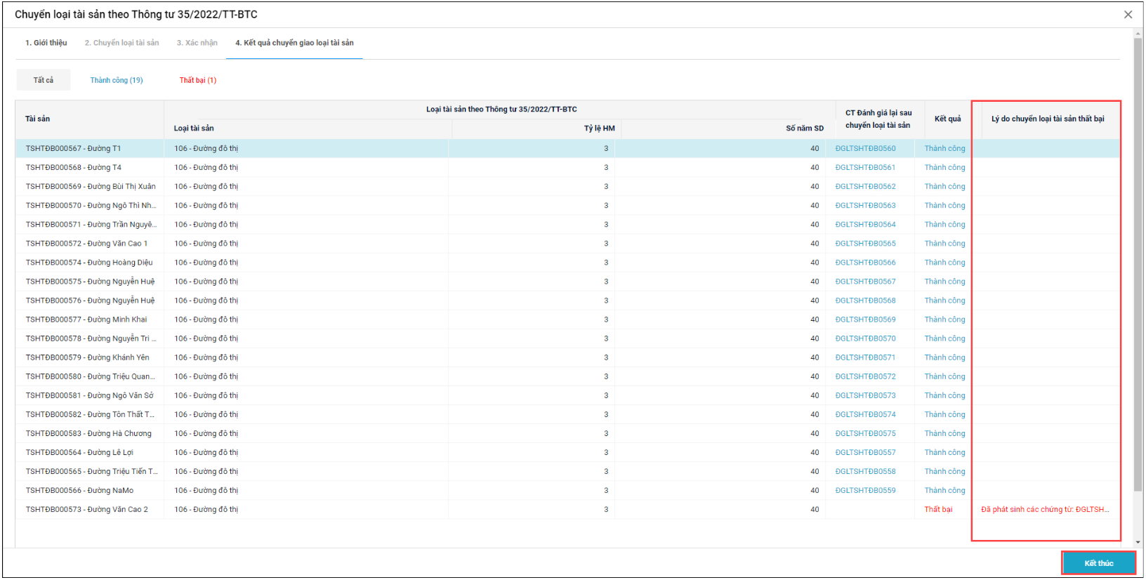 Hệ thống sẽ thông báo trạng thái chuyển loại tài sản Thành công hoặc Thất bại. Trường hợp chuyển loại thất bại, phần mềm sẽ hiển thị lý do tại cột Lý do chuyển loại tài sản thất bại.