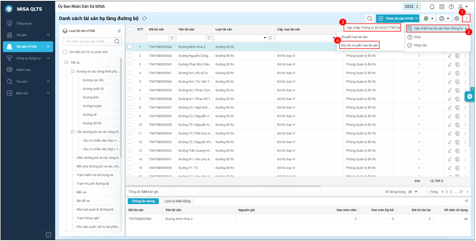 1. Tại giao diện Danh sách tài sản hạ tầng đường bộ, nhấn vào biểu tượng Tùy chọn, chọn Cập nhật loại tài sản theo thông tư, chọn Cập nhật TT 35/2022/TT-BTC, chọn Hủy bỏ chuyển loại tài sản.