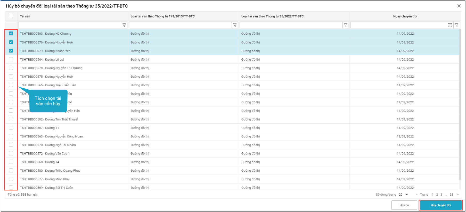 2. Phần mềm sẽ hiển thị lên danh sách hủy chuyển đổi. Tích chọn tài sản và nhấn Hủy chuyển đổi.