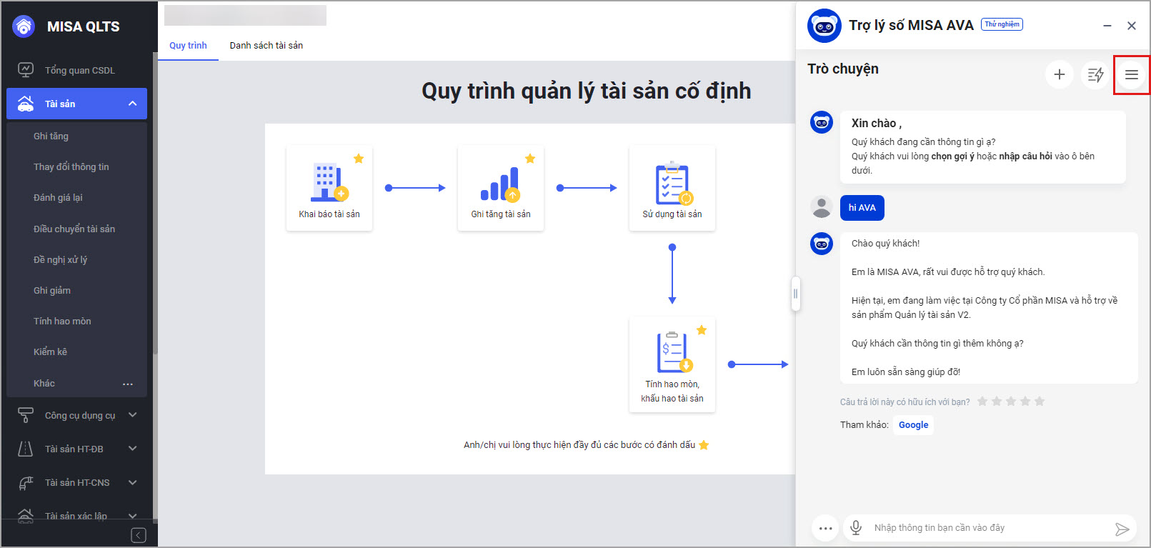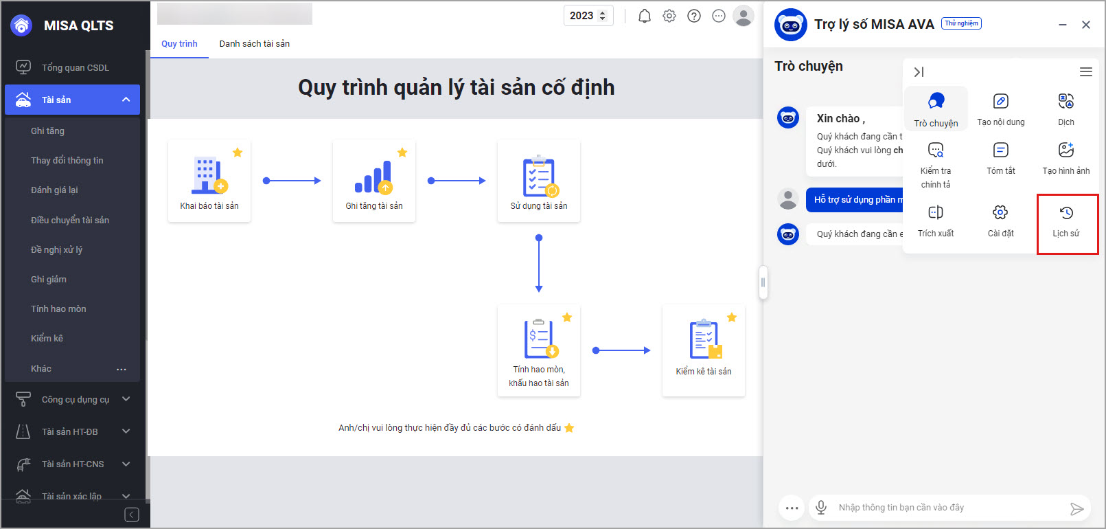 Khi tương tác với trợ lý số MISA AVA, nếu anh/chị có nhu cầu xem lại lịch sử chat anh/chị thực hiện như sau: