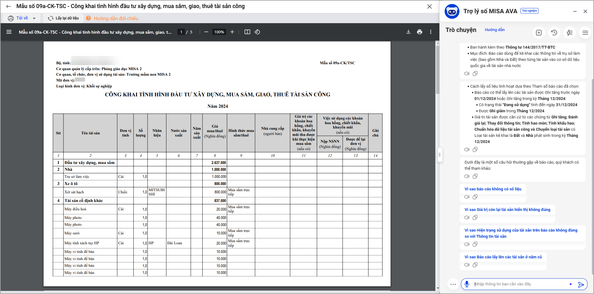 • Khi xem báo cáo 09a-CK-TSC: Công khai tình hình đầu tư xây dựng, mua sắm, giao, thuê tài sản công trợ lý số MISA AVA luôn hỗ trợ để anh/chị có thể hiểu hơn các thông tin trên báo cáo.