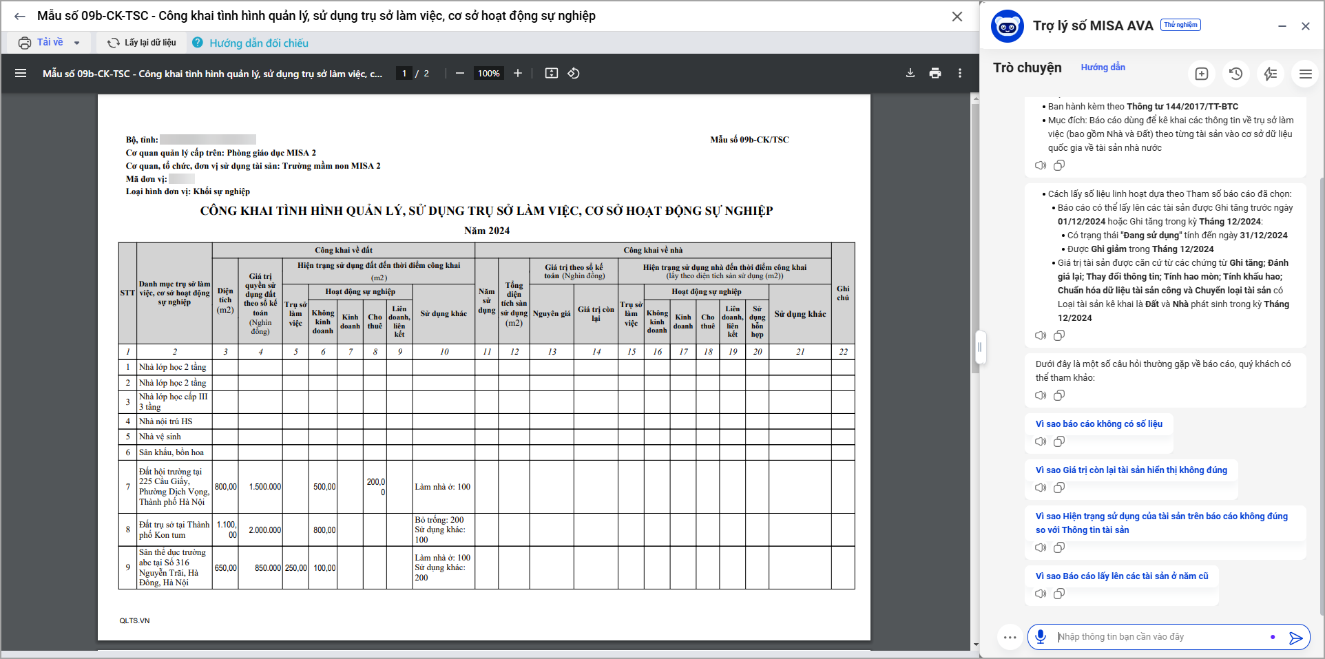 • Khi xem báo cáo 09b-CK-TSC: Công khai tình hỉnh quản lý, sử dụng trụ sở làm việc, cơ sở hoạt động sự nghiệp trợ lý số MISA AVA luôn hỗ trợ để anh/chị có thể hiểu hơn các thông tin trên báo cáo.