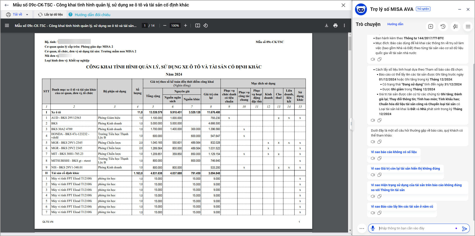 • Khi xem báo cáo 09c-CK-TSC: Công khai tình hình quản lý, sử dụng xe ô tô và tài sản cố định khác trợ lý số MISA AVA luôn hỗ trợ để anh/chị có thể hiểu hơn các thông tin trên báo cáo.