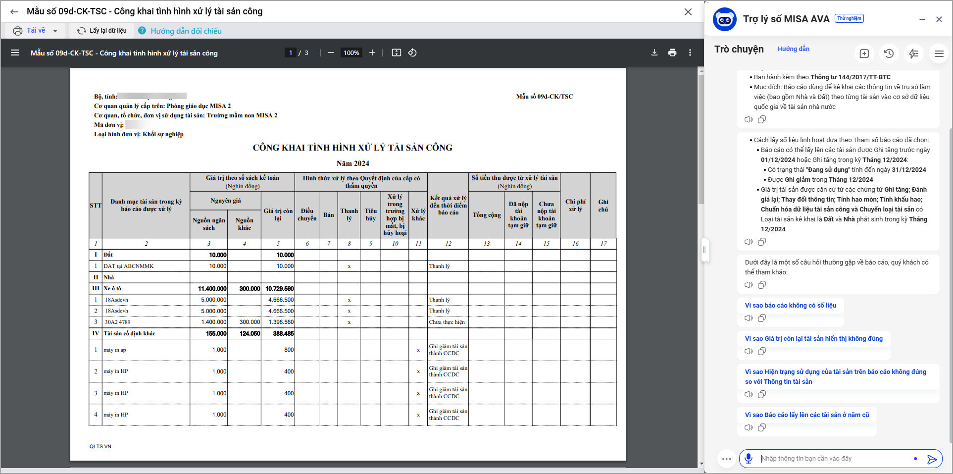 • Khi xem báo cáo 09d-CK-TSC: Công khai tình hình xử lý tài sản công trợ lý số MISA AVA luôn hỗ trợ để anh/chị có thể hiểu hơn các thông tin trên báo cáo.