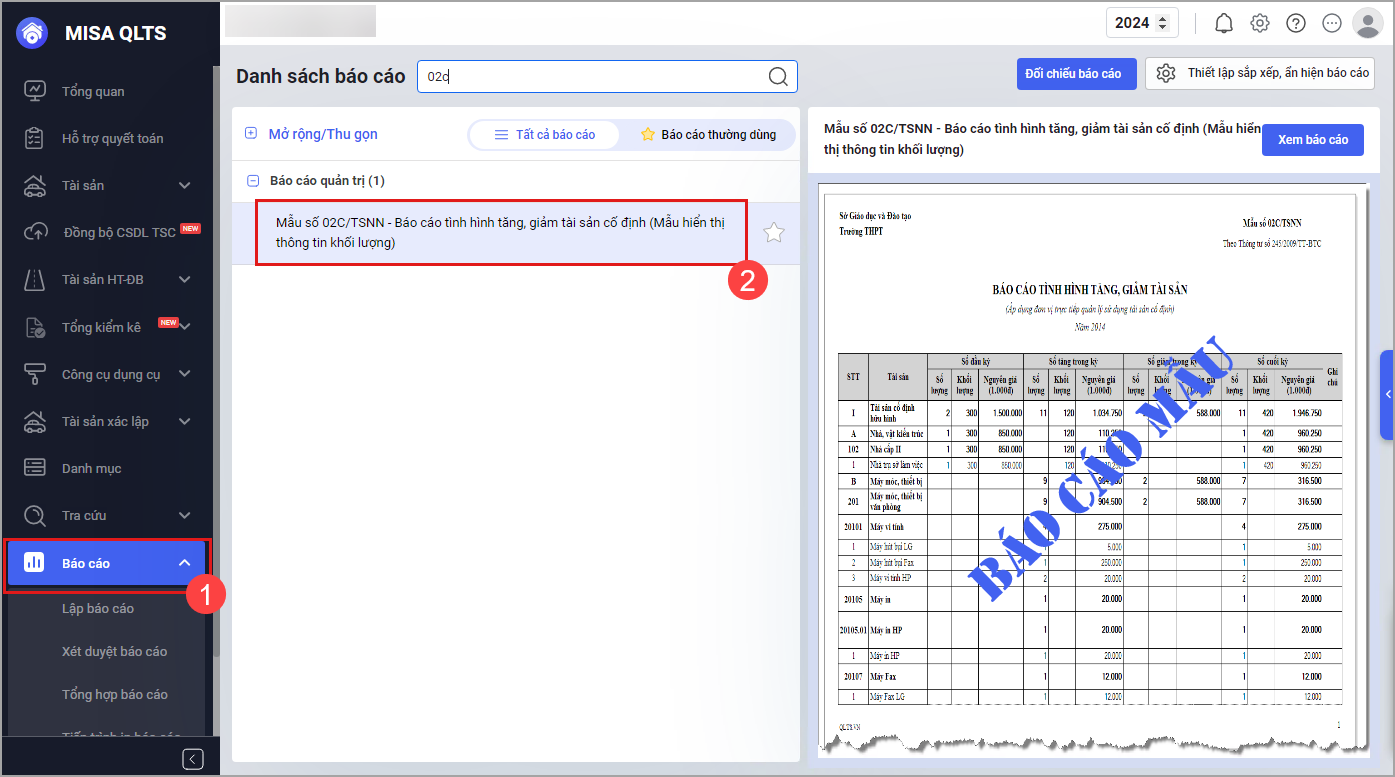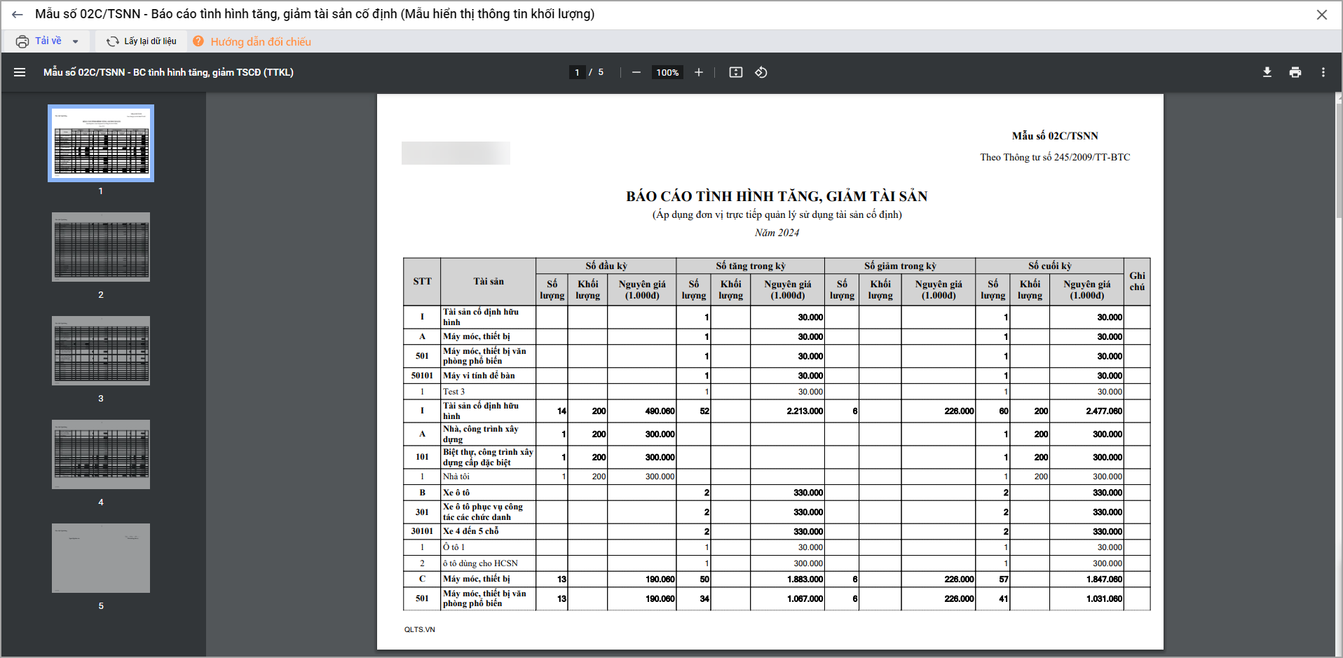Tại menu Báo cáo\Báo cáo quản trị: Phần mềm đáp ứng in 2 báo cáo Mẫu số 02C/TSNN và Mẫu 01/KK nhưng 2 báo cáo này có quy tắc làm tròn khác nhau.
