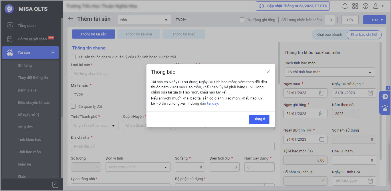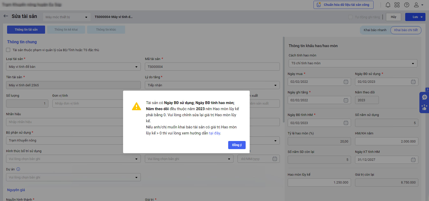 2.1. Cảnh báo khi khai báo tài sản có năm theo dõi, năm bắt đầu sử dụng, năm bắt đầu tính hao mòn/khấu hao và giá trị hao mòn/khấu hao lũy kế không phù hợp.