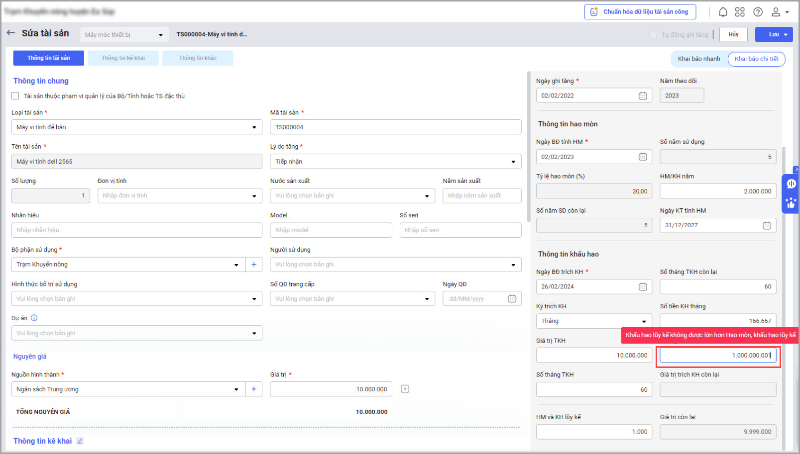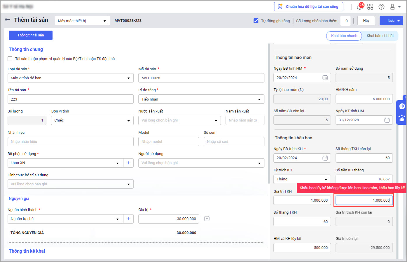• Cảnh báo khi khai báo tài sản vừa tính hao mòn vừa trích khấu hao có giá trị khấu hao lũy kế lớn hơn hao mòn.