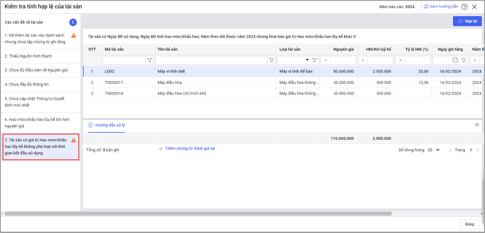 • Kiểm tra và cảnh báo khi khai báo tài sản có năm theo dõi, năm bắt đầu sử dụng, năm bắt đầu tính hao mòn/khấu hao và giá trị hao mòn/khấu hao lũy kế không phù hợp.