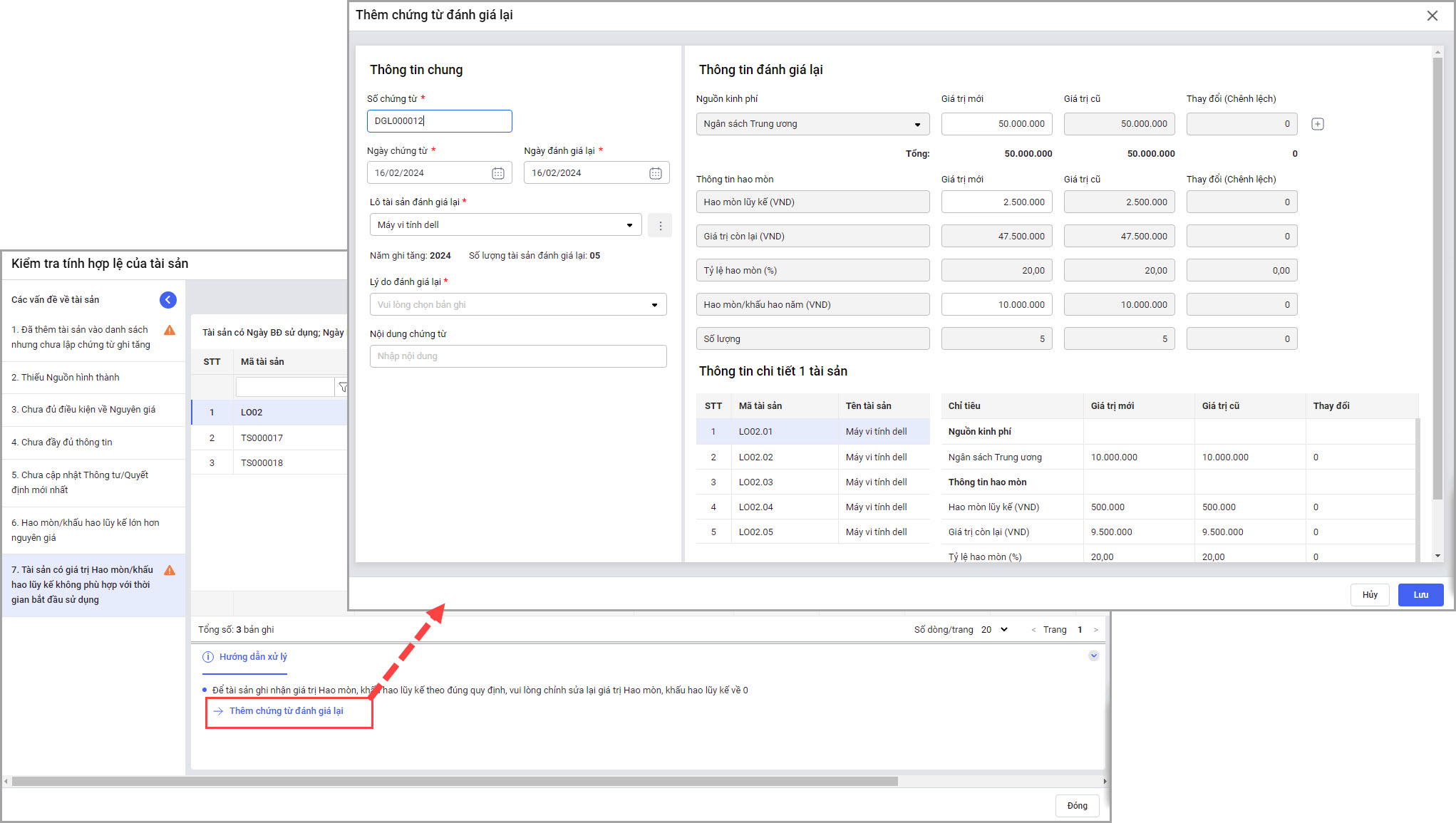 • Lưu ý: Nếu Sửa tài sản mà tài sản đã phát sinh chứng từ sau ngày ghi tăng thì phần mềm hiển thị cảnh báo, anh/chị tiến hành Lập chứng từ đánh giá lại.
