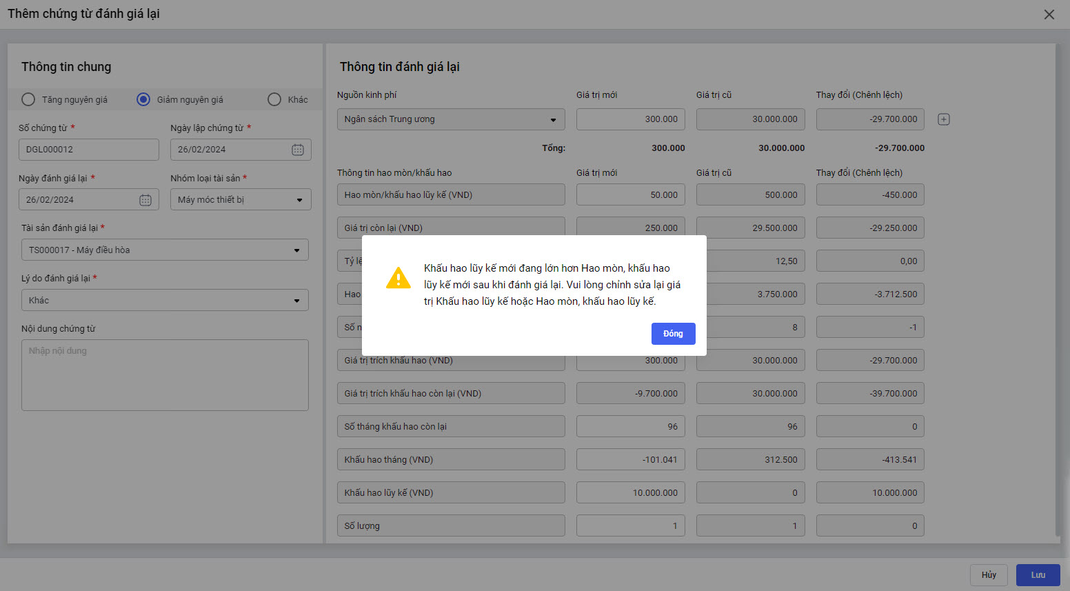 • Tại menu Tài sản\Đánh giá lại\Thêm\Sửa chứng từ: nếu sửa giá trị Khấu hao lũy kế > Hao mòn, khấu hao lũy kế, khi Lưu phần mềm sẽ hiển thị thông báo. Anh/chị tiến hành sửa lại giá trị Khấu hao lũy kế hoặc Hao mòn, khấu hao lũy kế.