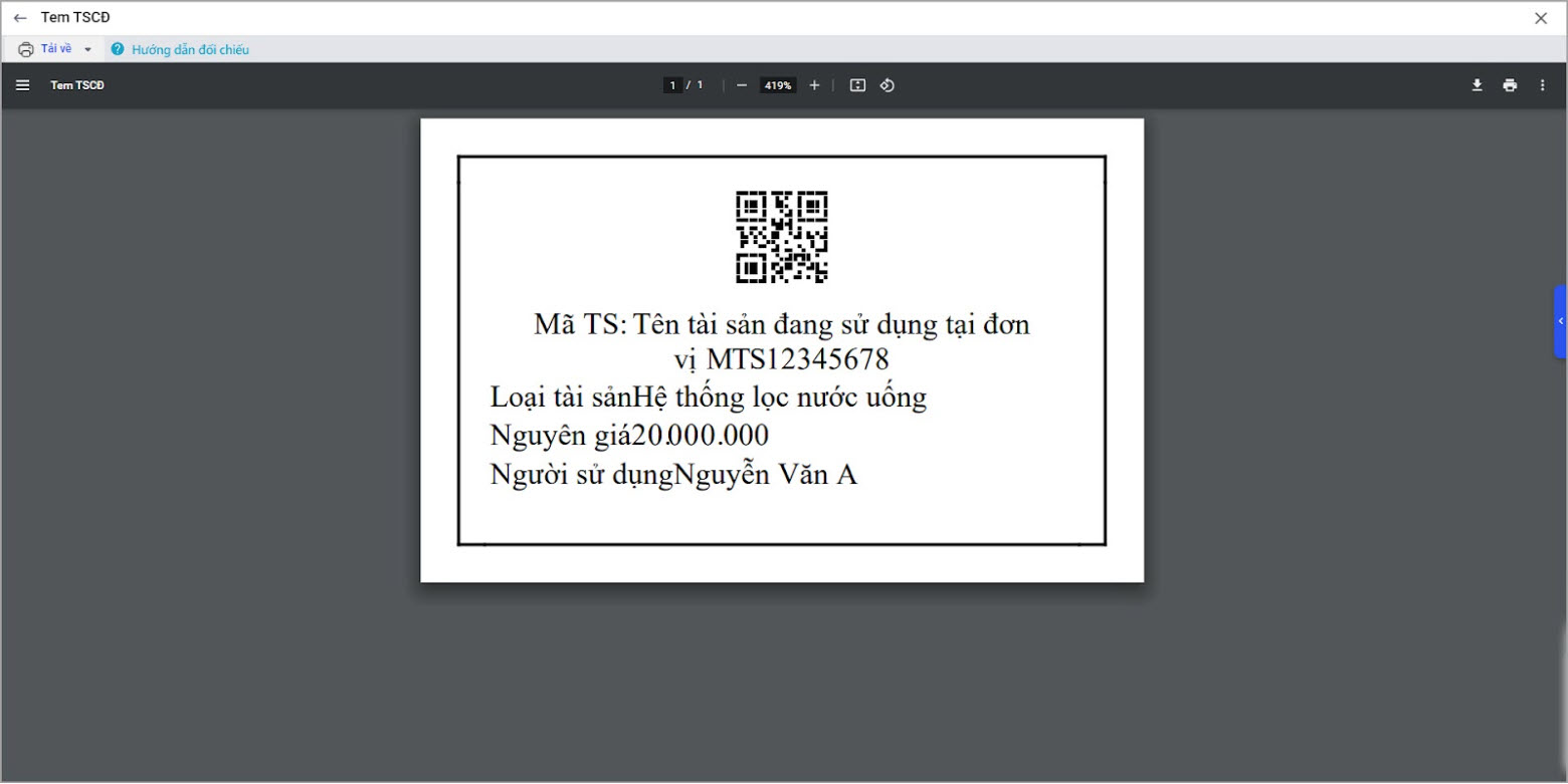 Tại đơn vị, ngay sau khi kiểm kê TSCĐ, cán bộ quản lý tài sản sẽ in nhãn kiểm kê và dán lên tài sản để xác nhận đã được kiểm kê. Đối với những tài sản có tên hoặc tên phòng ban quá dài, hệ thống sẽ tự động hiển thị thông tin xuống dòng, giúp người dùng dễ dàng đọc đầy đủ thông tin và tránh nhầm lẫn khi đối chiếu hoặc ghi nhận lại.