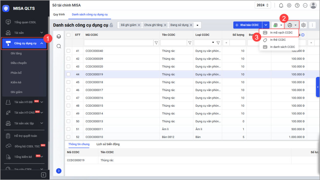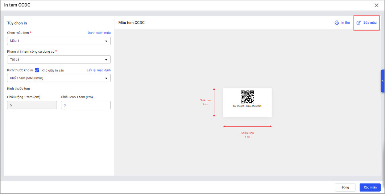 Vào Công cụ dụng cụ\ nhấn biểu tượng máy in ?️ trên Danh sách công cụ dụng cụ\ chọn In mã vạch CCDC.