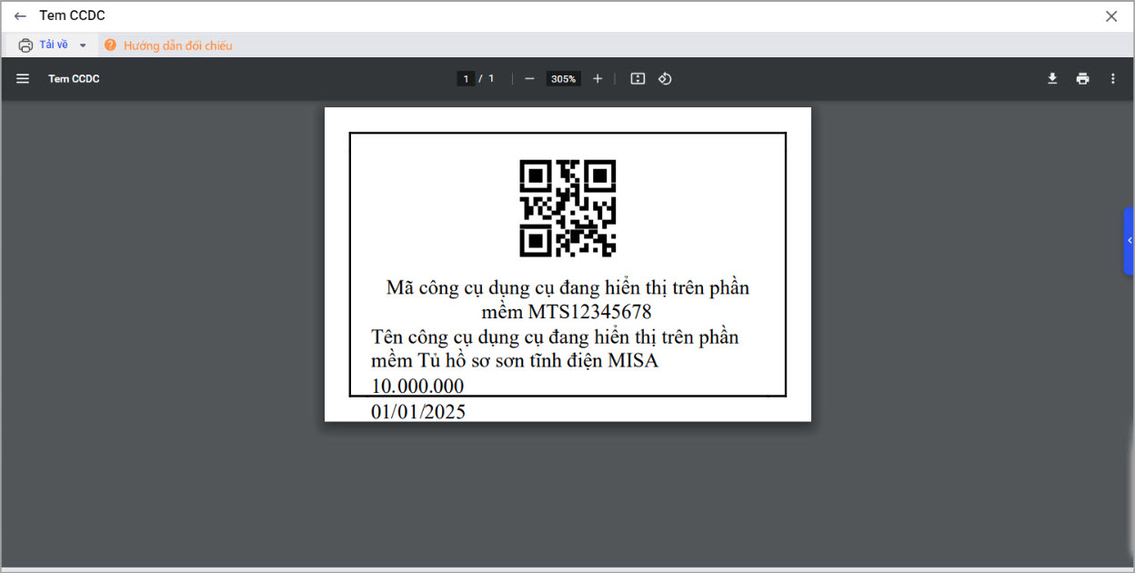 Khi anh/chị thiết lập chế độ xuống dòng, các trường thông tin quá dài sẽ tự động xuống dòng khi in tem TSCĐ để đảm bảo hiển thị đầy đủ nội dung.