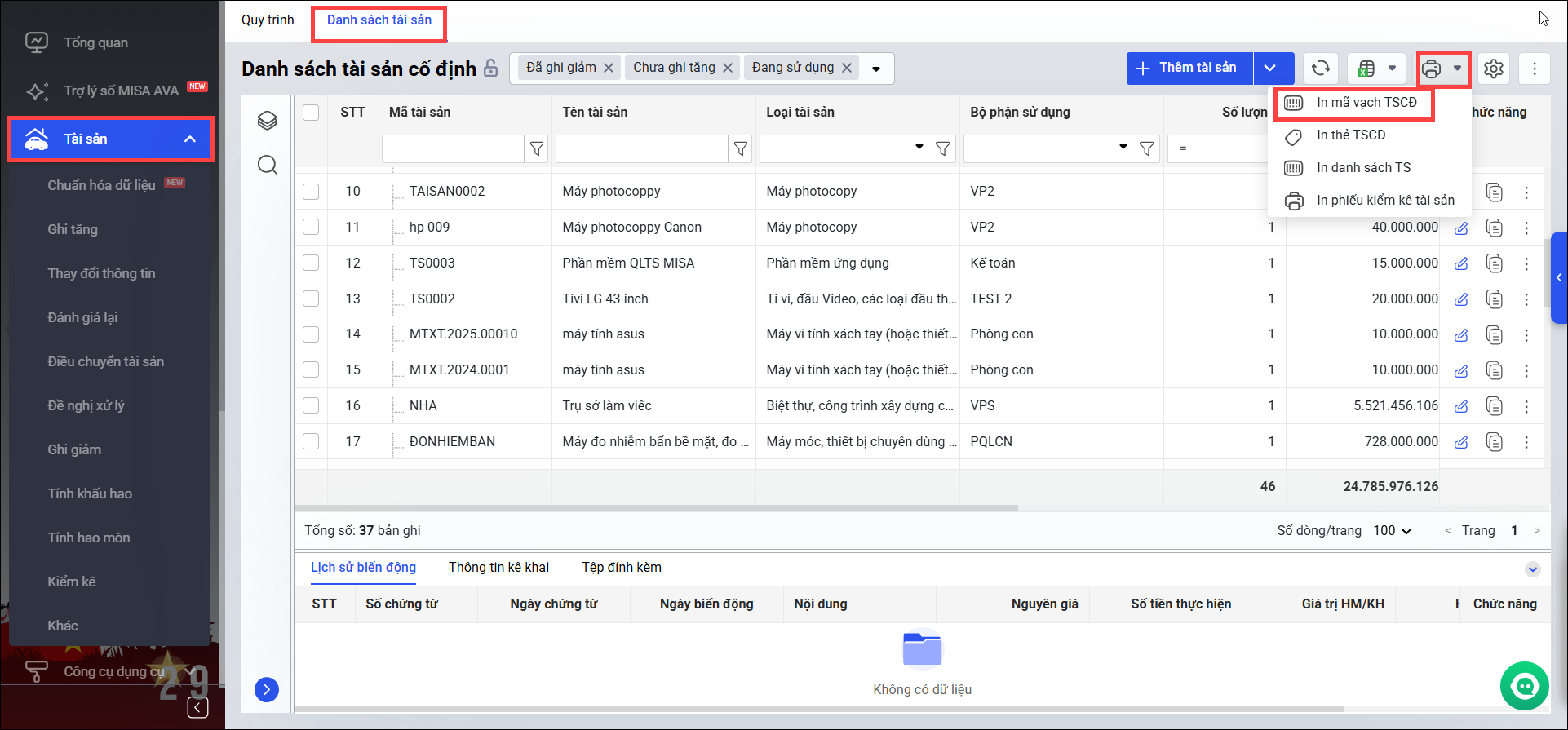 Vào Tài sản\ nhấn biểu tượng máy in?️trên Danh sách tài sản\ chọn In mã vạch TSCĐ.