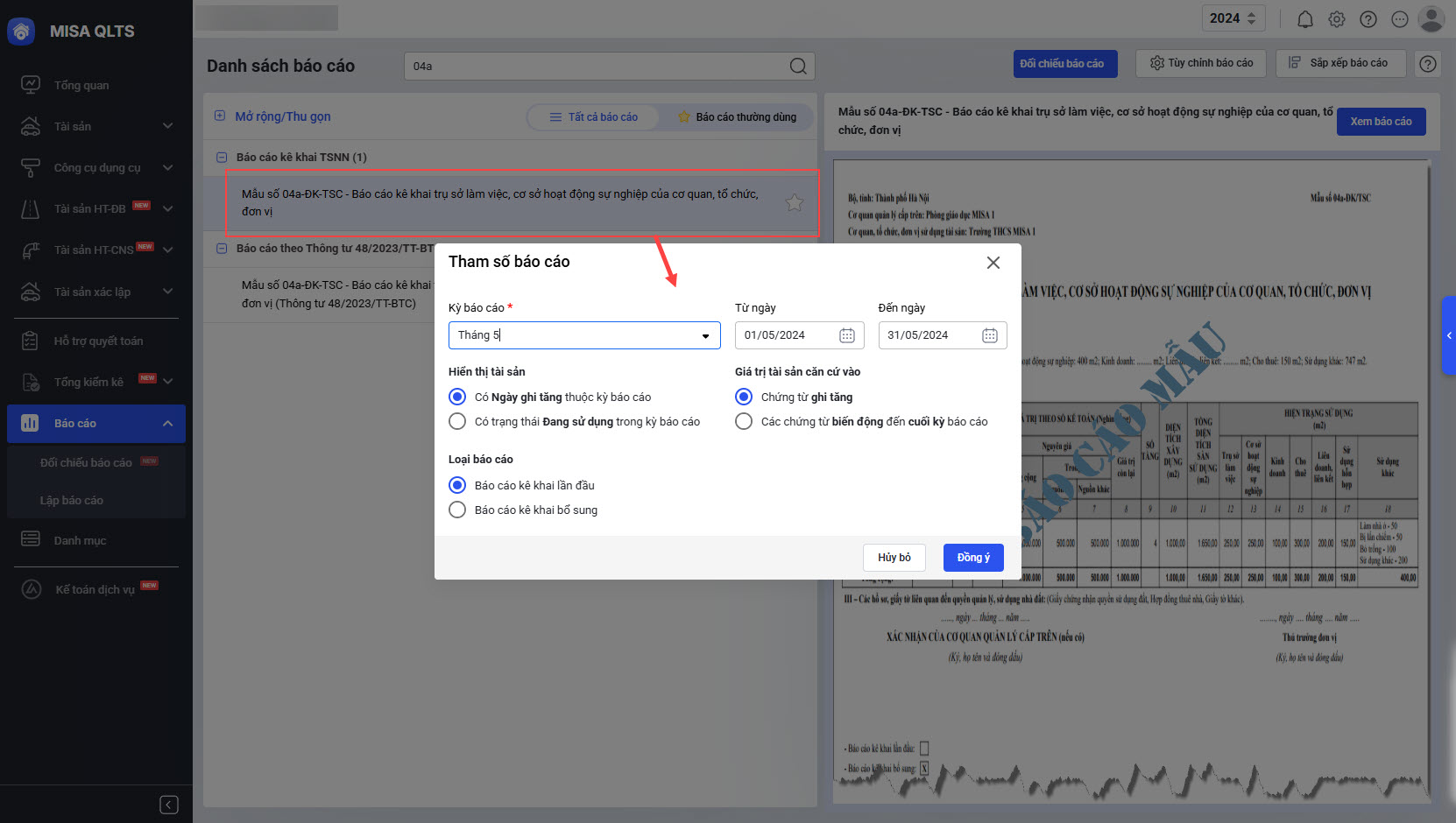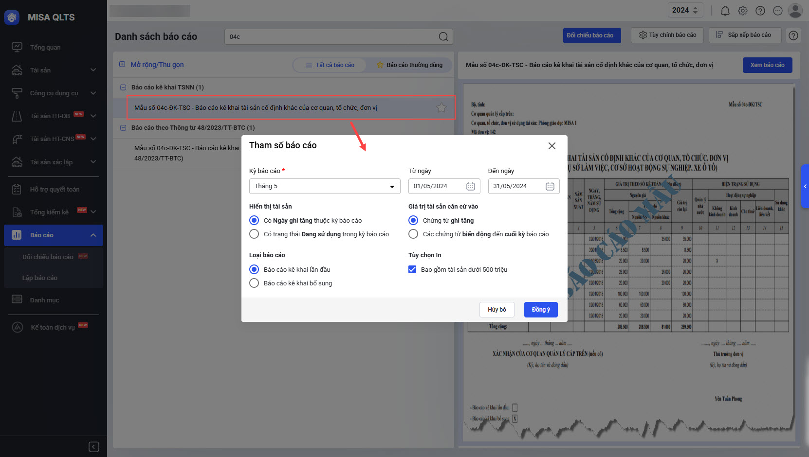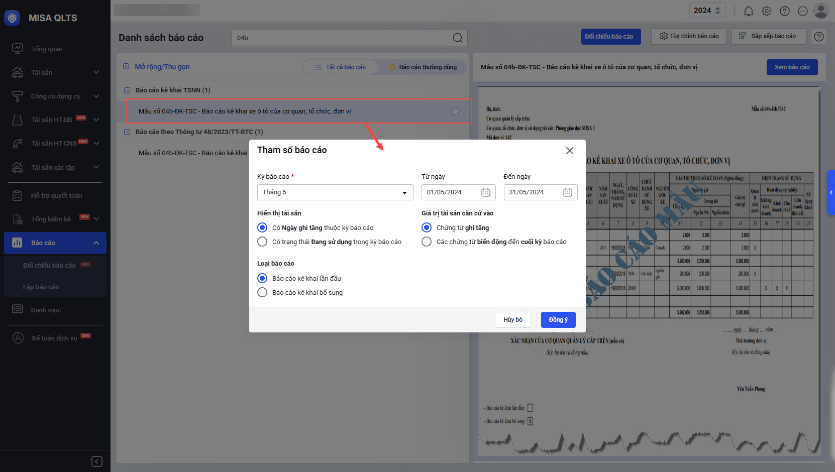 Bài viết này giúp anh/chị hiểu về việc đồng bộ tham số báo cáo khi in và khi lập các mẫu báo cáo kê khai tài sản (04a-ĐK-TSC, 04b-ĐK-TSC, 04c-ĐK-TSC), đảm bảo số liệu thống nhất và dễ dàng theo dõi khi gửi cấp trên.