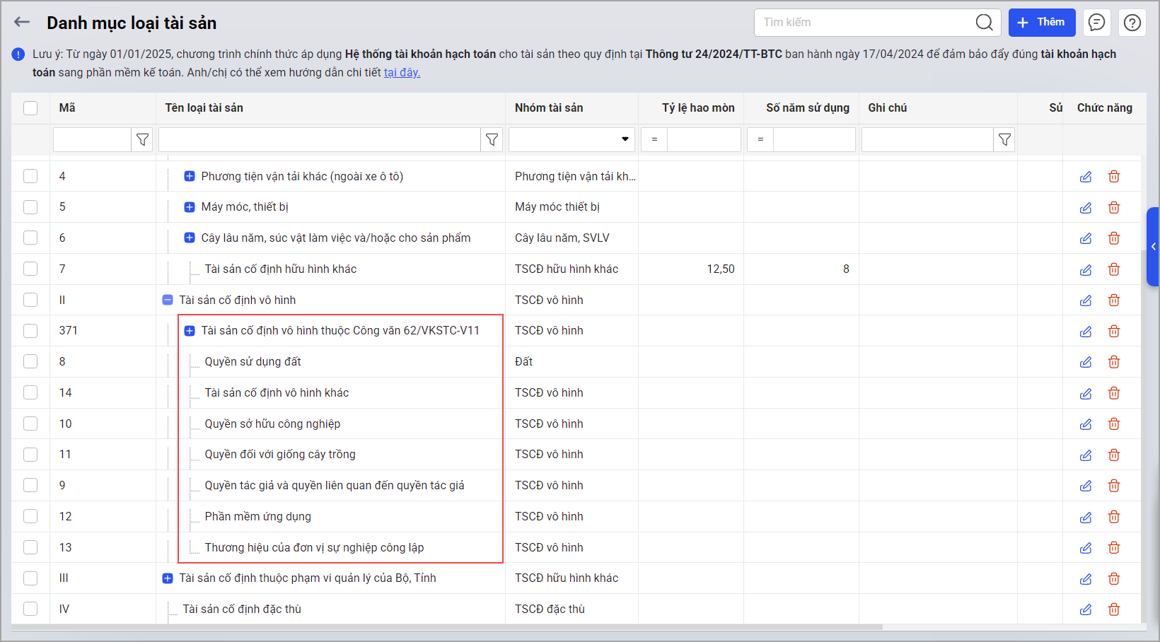- Tài sản cố định vô hình mã loại 371 vào nhóm II. Tài sản cố định vô hình gồm Loại tài sản con thuộc Danh mục TSCĐ vô hình theo Công văn số 62/VKSTC-V11
