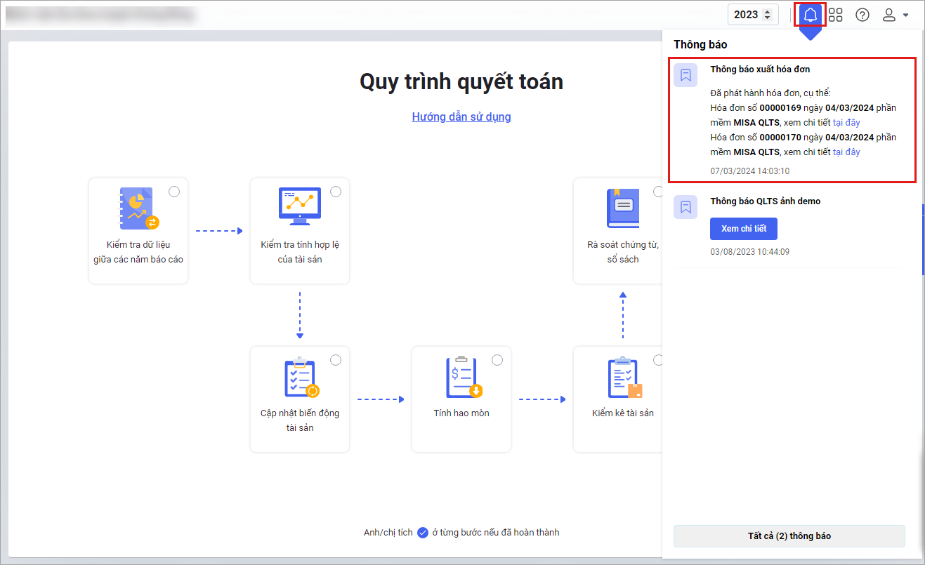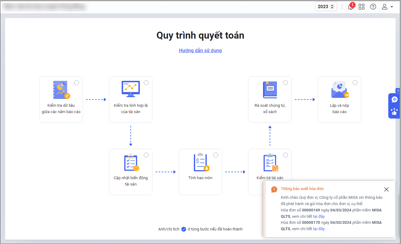 Khi đơn vị có hóa đơn thanh toán mua hàng mới/gia hạn phần mềm MISA iGOV Tài sản đã phát hành phần mềm sẽ hiển thị thông báo như sau: Anh/chị chọn tại đây để xem chi tiết hóa đơn.