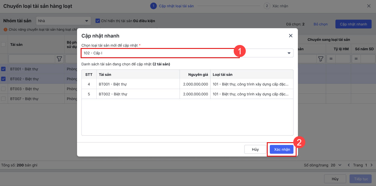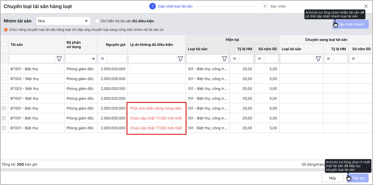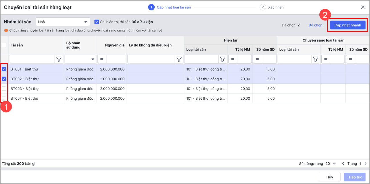 - Cách 2: Hoặc tích chọn nhiều tài sản để cập nhật nhanh loại tài sản