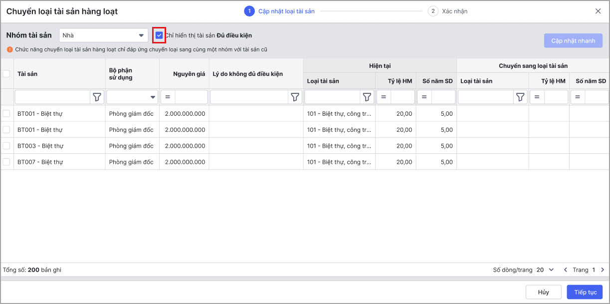 - Anh/chị tích chọn ô Chỉ hiển thị tài sản Đủ điều kiện để lọc tài sản đủ điều kiện chuyển loại