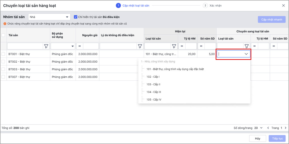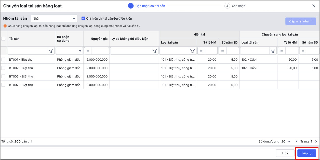 Bước 4: Sau khi chọn loại tài sản mới cho tài sản xong, anh/chị chọn Tiếp tục