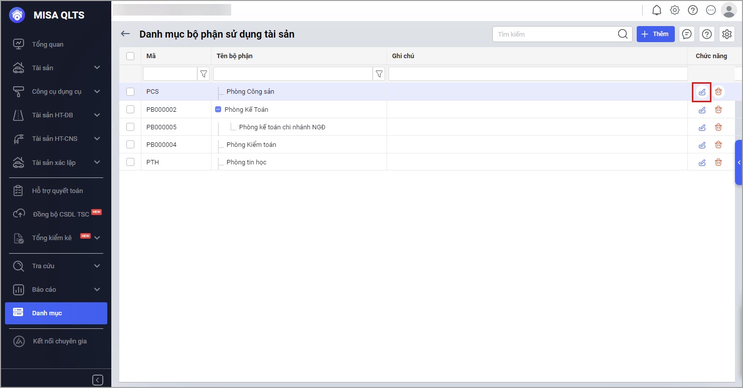 Bước 1: Tại menu Danh mục\Danh mục Bộ phận sử dụng (phòng ban): Đối với bộ phận cha không phát sinh tài sản, nếu muốn chỉnh sửa thông tin bộ phận sử dụng tài sản anh/chị chọn biểu tượng cây bút.
