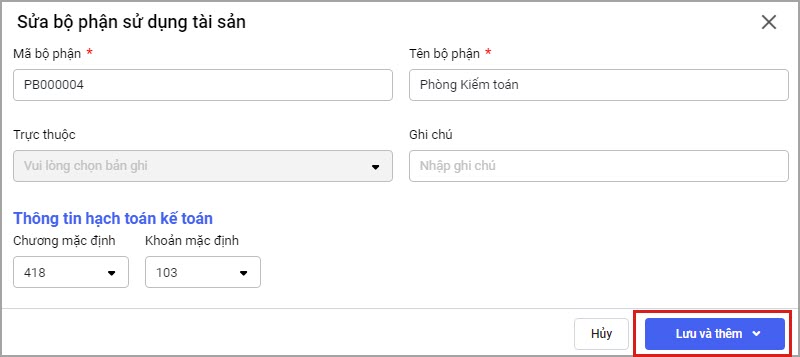 Bước 2: Phần mềm hiển thị thông tin Bộ phận sử dụng anh/chị đã thiết lập trước đó, anh/chị sửa lại thông tin, sau đó chọn Lưu để lưu thay đổi.