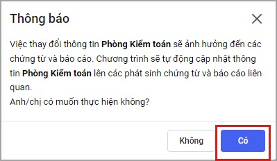 Bước 3: Phần mềm sẽ hiển thị thông báo anh/chị nhấn Có để thay đổi thông tin bộ phận sử dụng