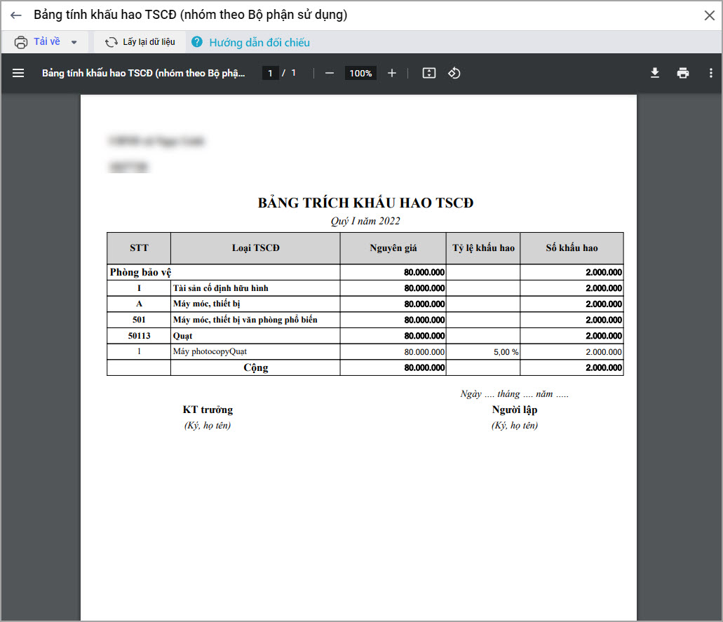 - Danh sách tài sản sẽ được nhóm theo Bộ phận sử dụng.