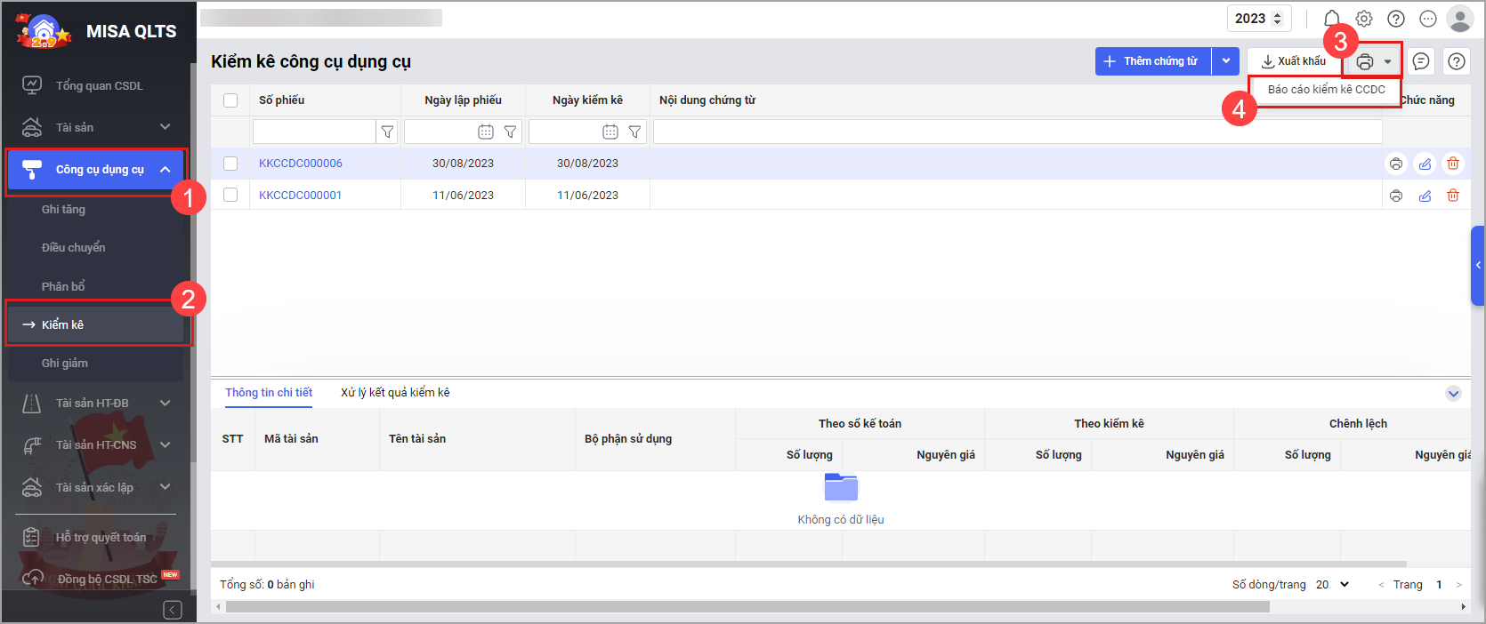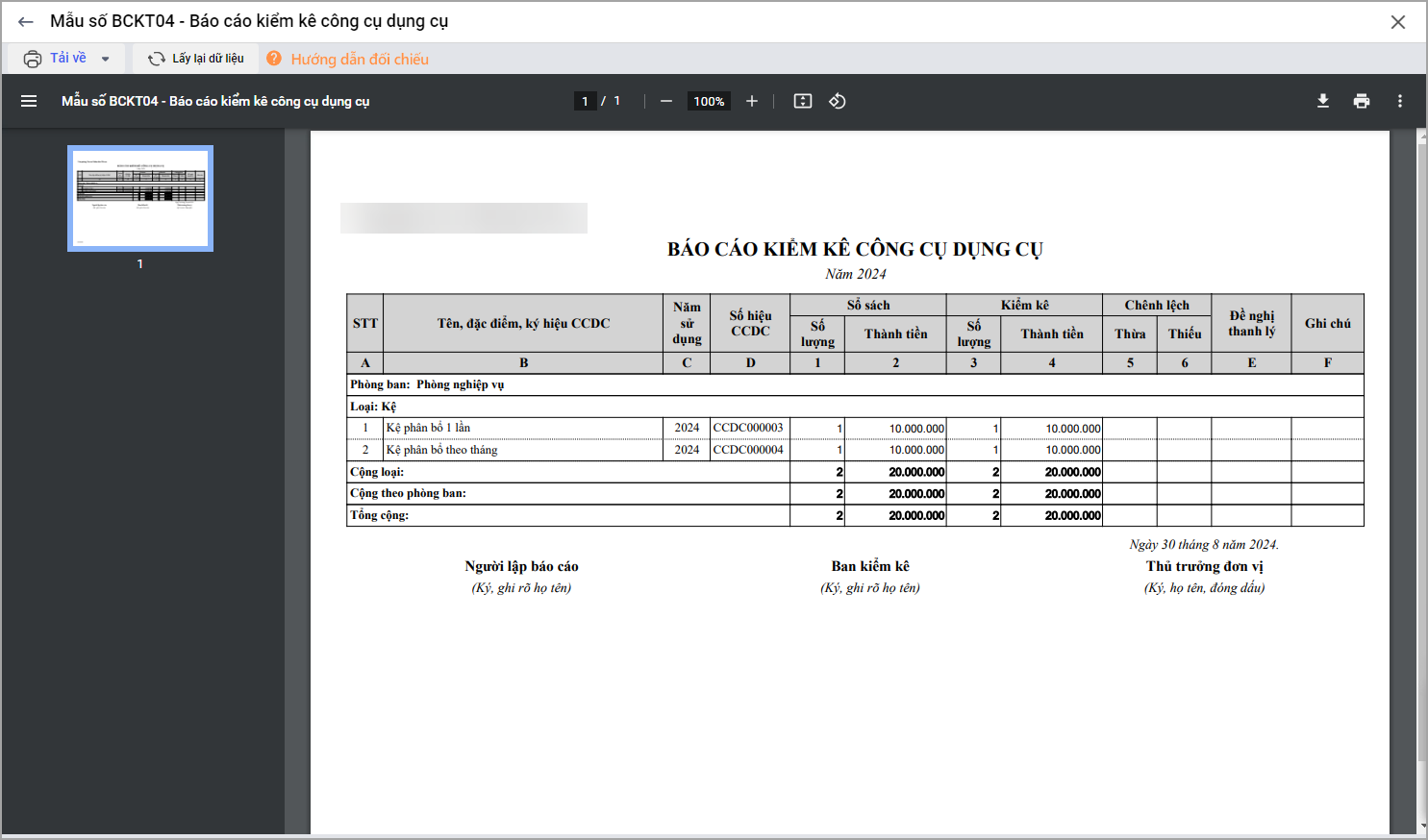 - Lưu ý: Trước khi in mẫu kiểm kê, bạn cần thực hiện Lập chứng từ kiểm kê công cụ dụng cụ theo hướng dẫn tại đây