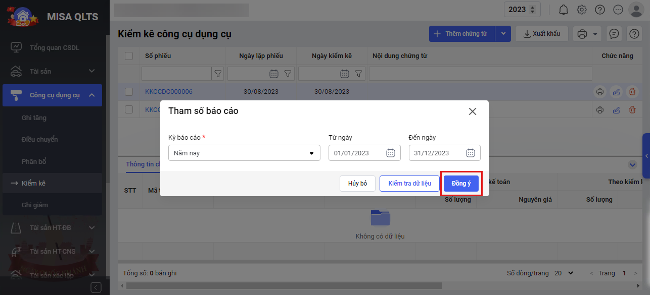 - Chọn Tham số báo cáo, Kỳ báo cáo là năm nay , sau đó chọn Đồng ý.
