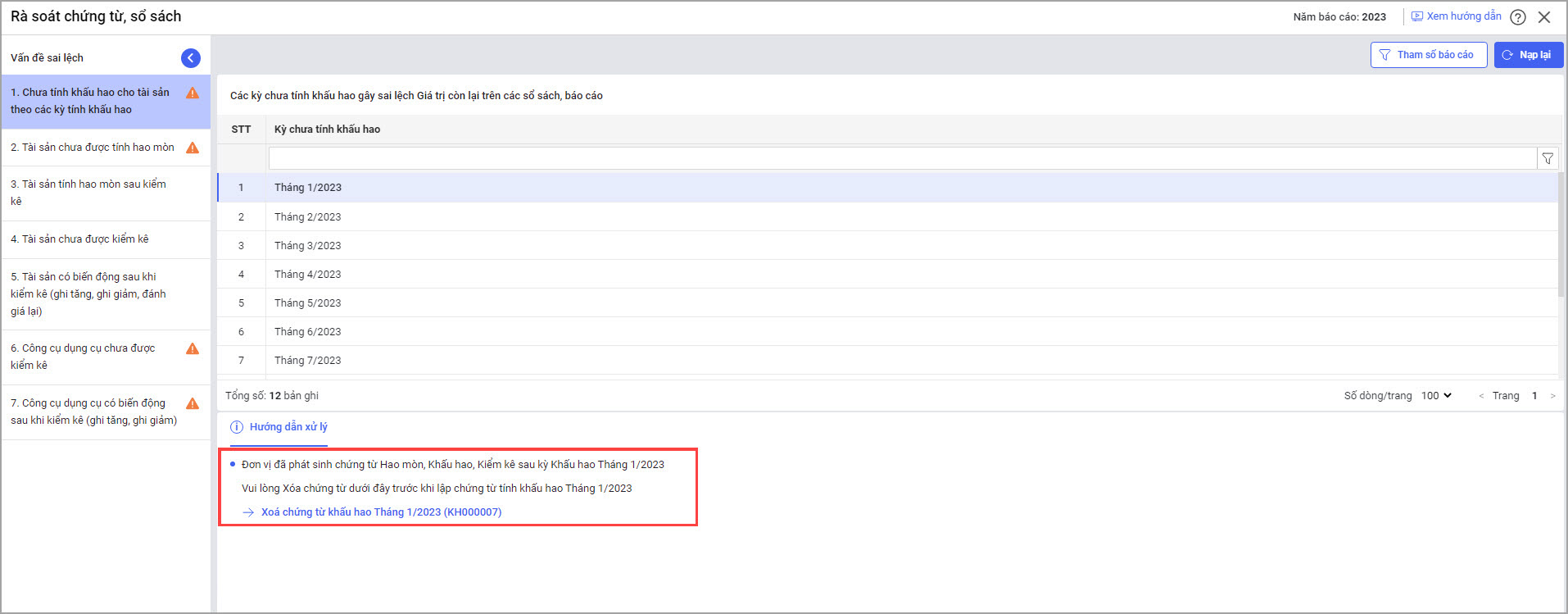 - Tại Rà soát chứng từ sổ sách\Chưa tính khấu hao cho tài sản theo các kỳ tính khấu hao: Khi có sai lệch phần mềm gợi ý hướng dẫn xử lý nhưng chưa rõ nghĩa.