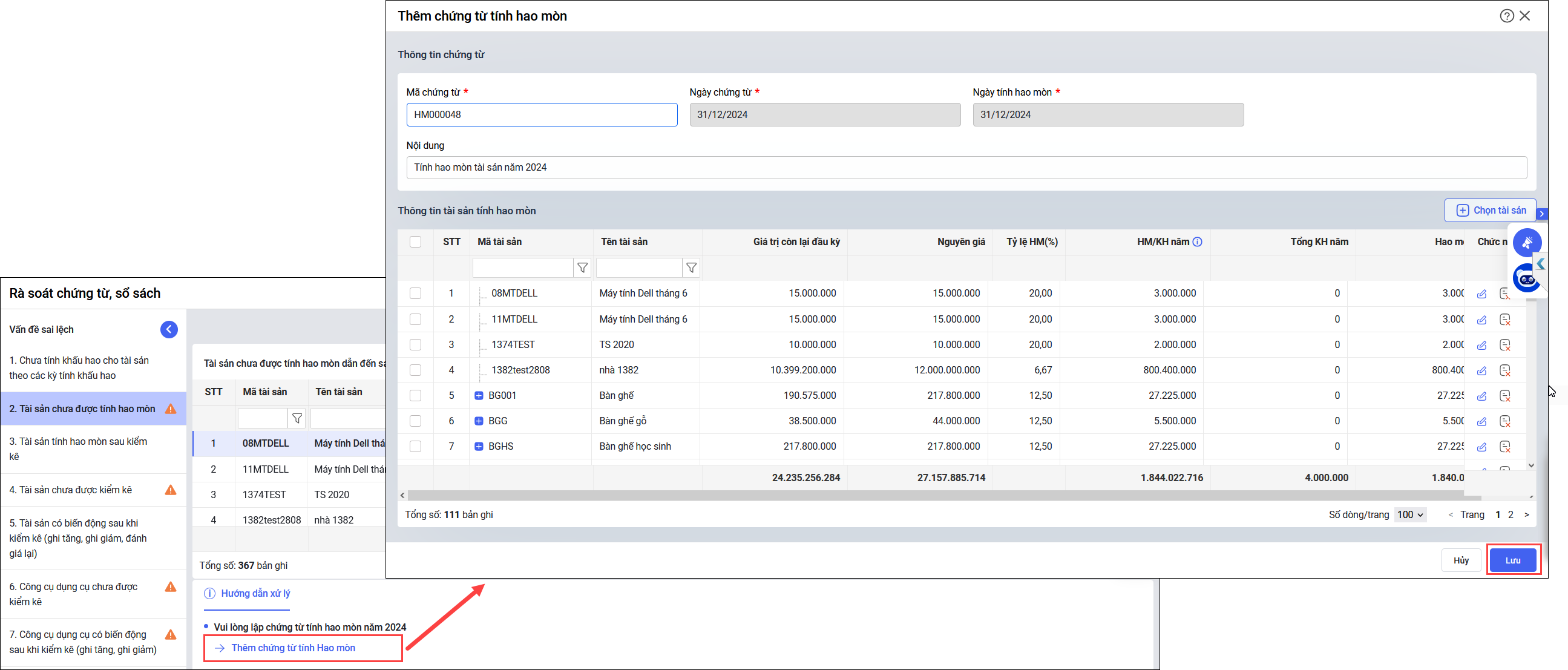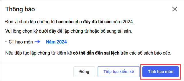 - Khi kiểm kê, phần mềm cảnh báo chưa lập chứng từ tính khấu hao và hao mòn nhưng thực tế, khách hàng đã lập nhưng thiếu, phần mềm không chỉ rõ.
