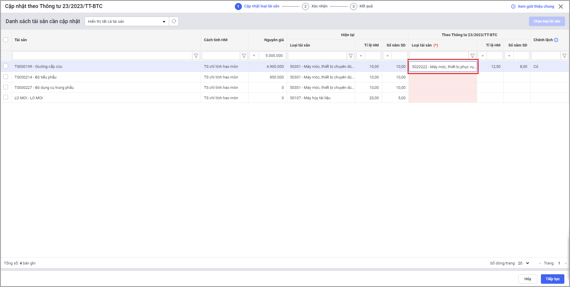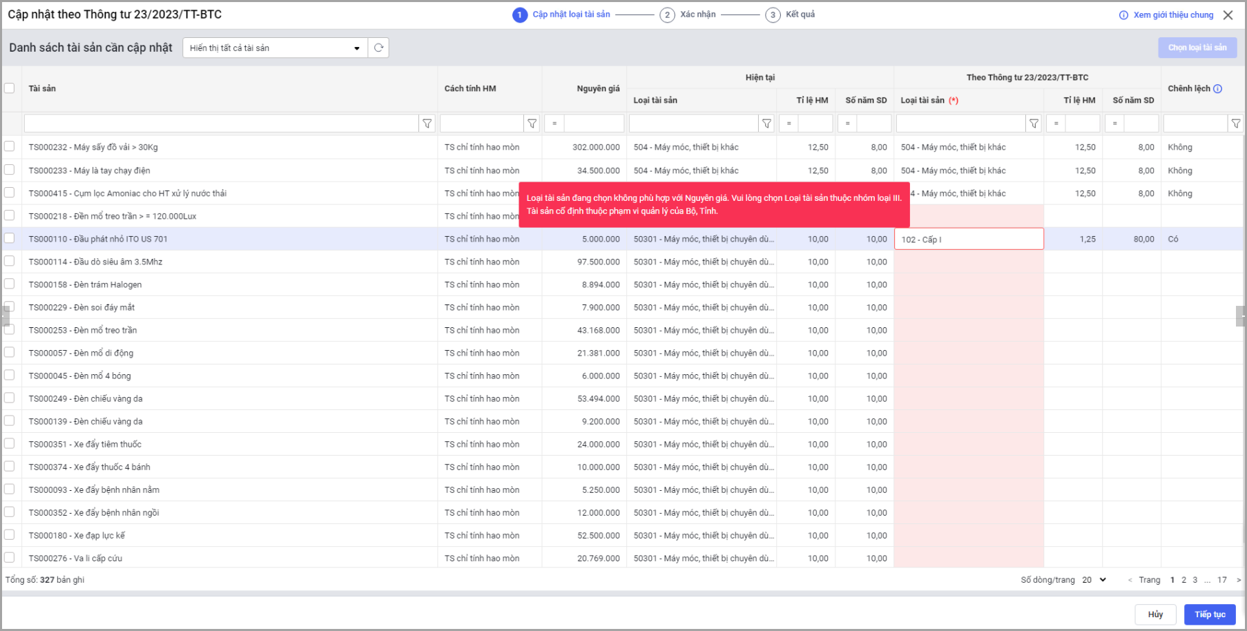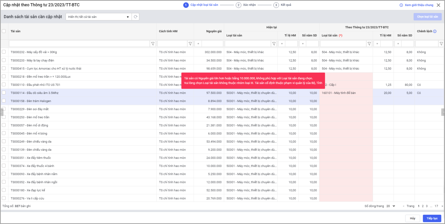 Tại menu Tài sản\Tùy chọn\Cập nhật tài sản theo TT/QĐ: tại Bước 2 Xác nhận, sau khi chọn Tiếp tục phần mềm kiểm tra Nguyên giá của tài sản có phù hợp với điều kiện Nguyên giá của Loại tài sản.