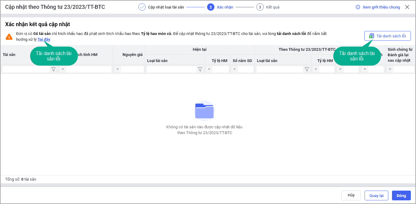 Nếu đơn vị có tài sản phát sinh chứng từ trích khấu hao theo tỷ lệ cũ thì phần mềm không cho phép cập nhật thông tư. Khi cập nhật thông tư cho những tài sản này phần mềm sẽ trả về danh sách tài sản lỗi, cán bộ QLTS không biết tải danh sách lỗi để xử lý.